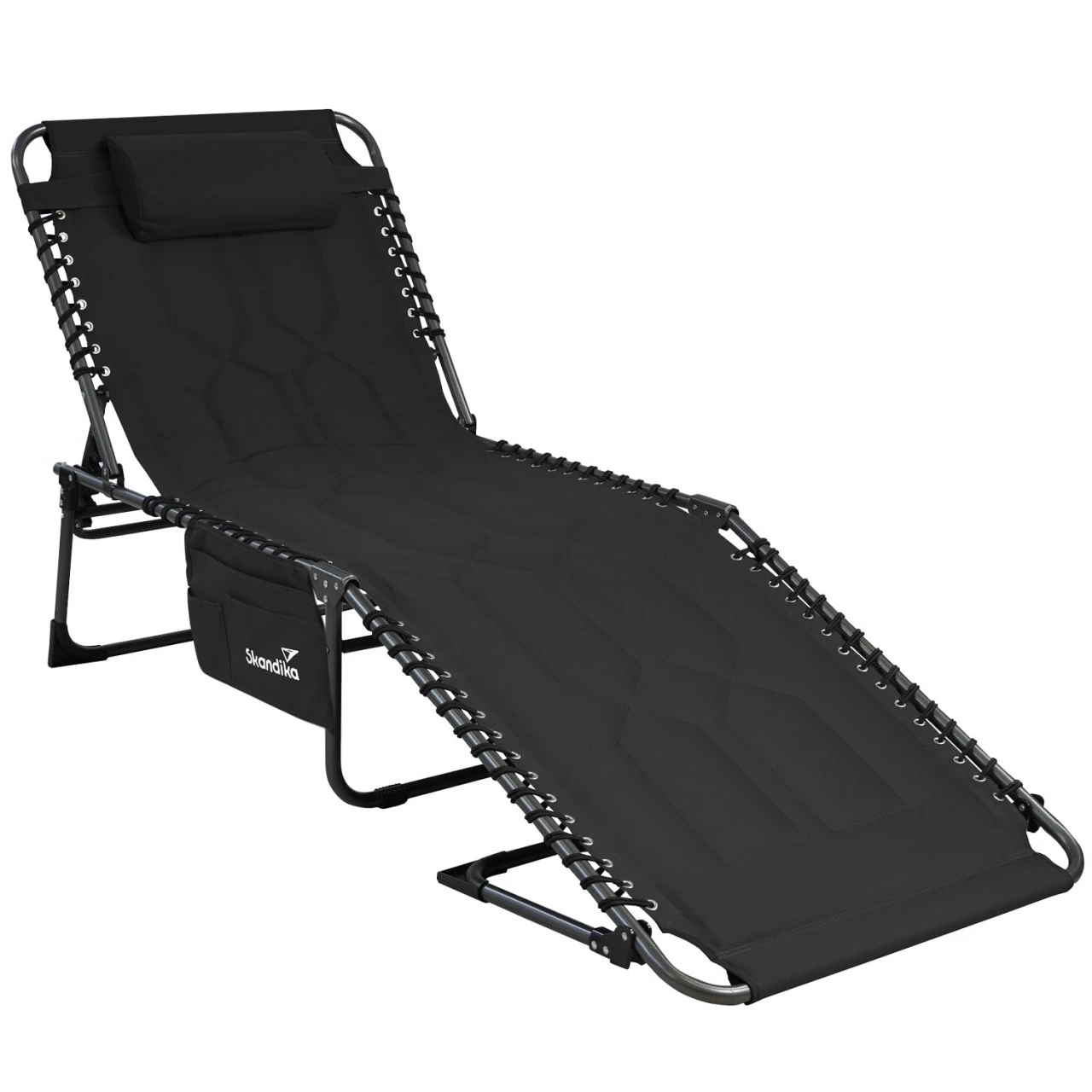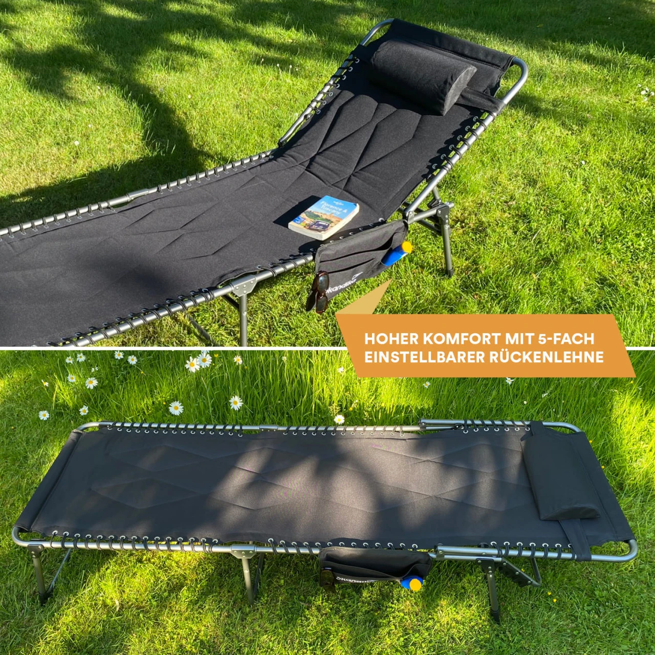 Der Bezug aus strapazierfähigem Polyestermaterial ist angenehm auf der Haut und ein passendes, weiches Kopfkissen kann bei Bedarf auf der Liegefläche positioniert und befestigt werden.