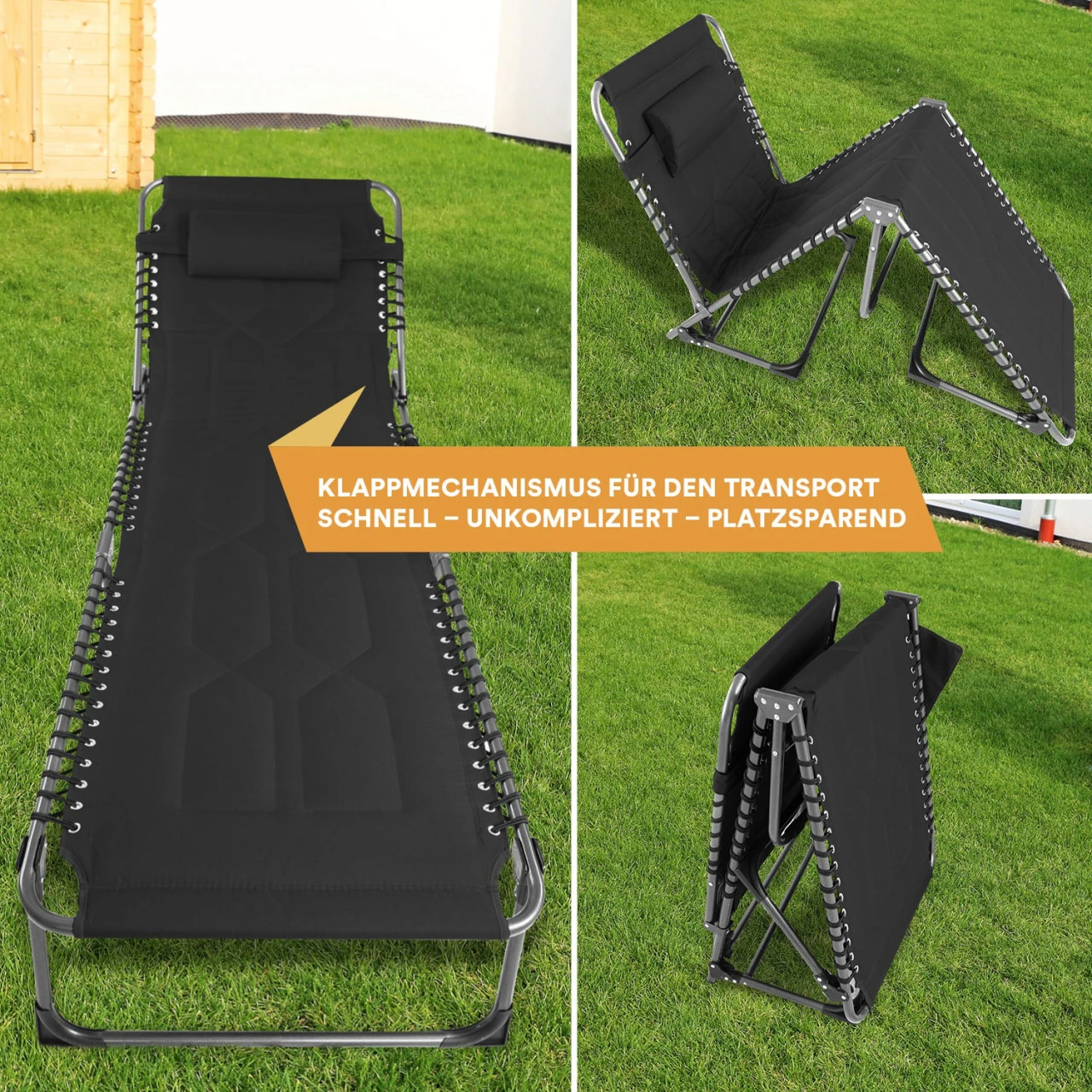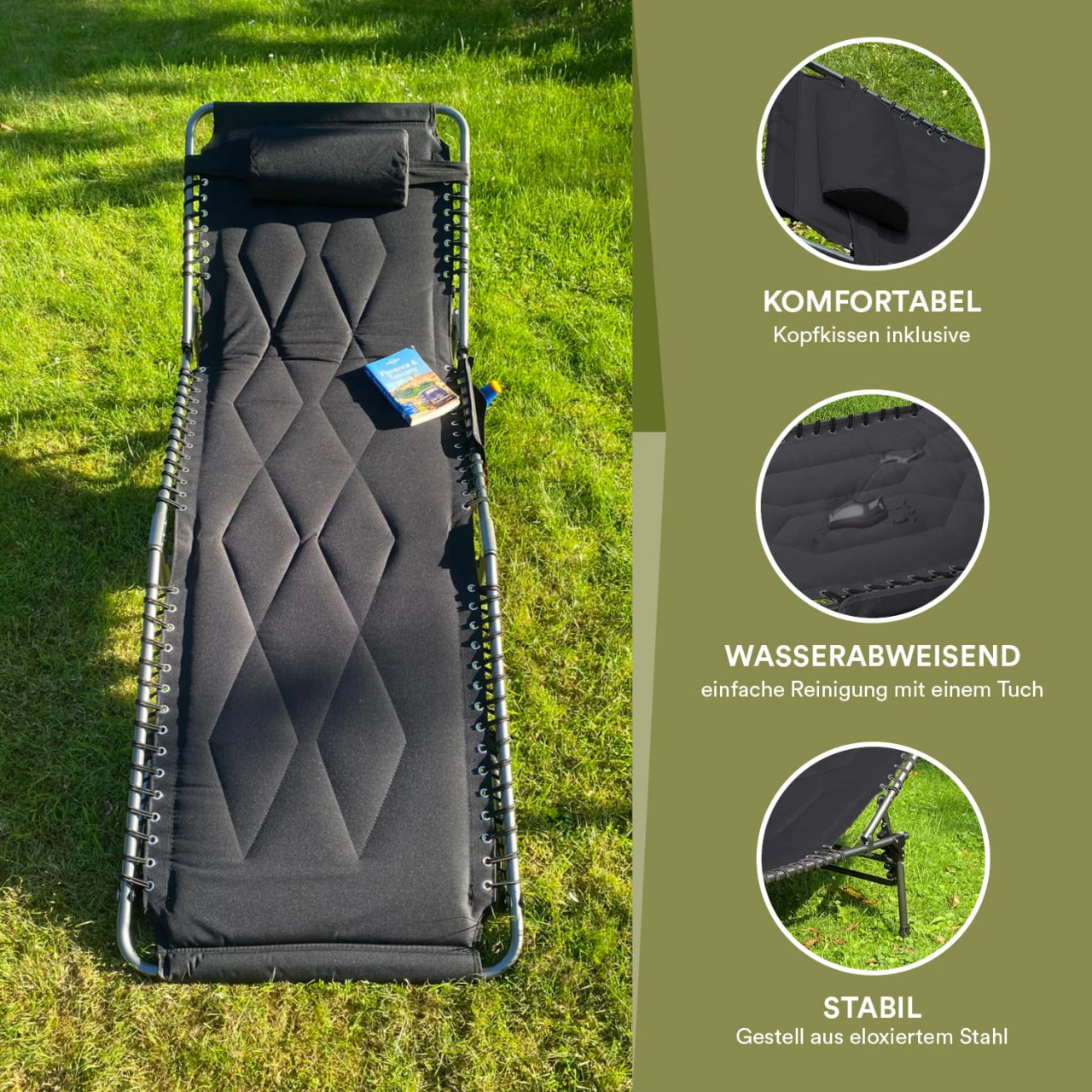 Die Sonnenliege ist perfekt für die Terrasse oder den Garten zu Hause, aber auch für den Einsatz auf dem Campingplatz, am Strand oder beim Festival.