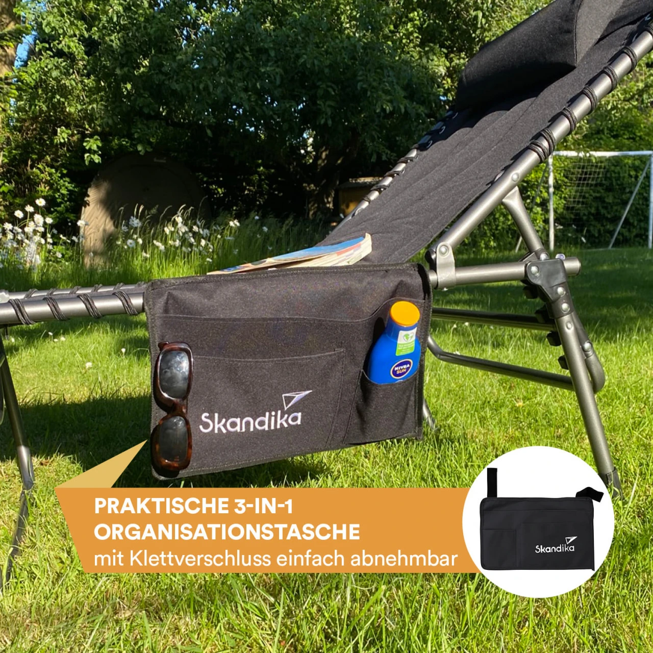 Das Lieblingsbuch, die Sonnenbrille und das Handy finden in den unterschiedlichen Fächern der abnehmbaren Organizer-Tasche an der Seite der Liege Platz und sind somit immer sicher und griffbereit.