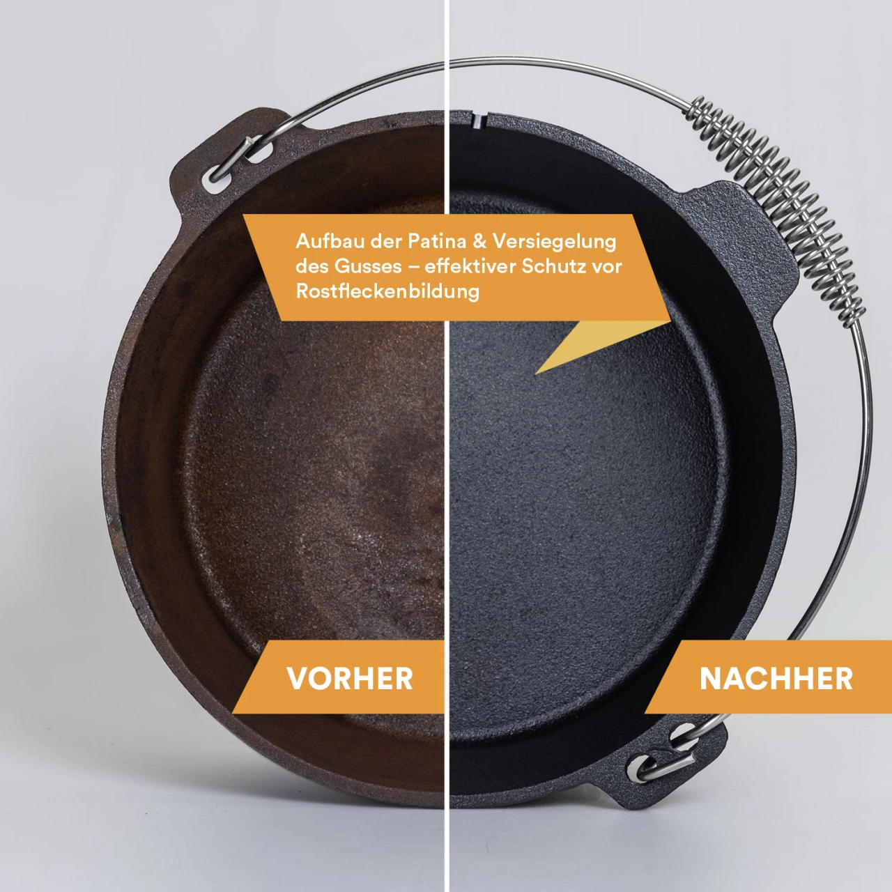 Bei regelmäßiger Anwendung der Paste baut sich die Patina von gusseisernen Produkten auf. Dies verhindert eine Rostfleckenbildung und schützt das Kochgeschirr langlebig. Die Patina verleiht dem Kochgeschirr zudem eine bessere Antihafteigenschaft und reduziert somit das Anbrennen von Speisen.