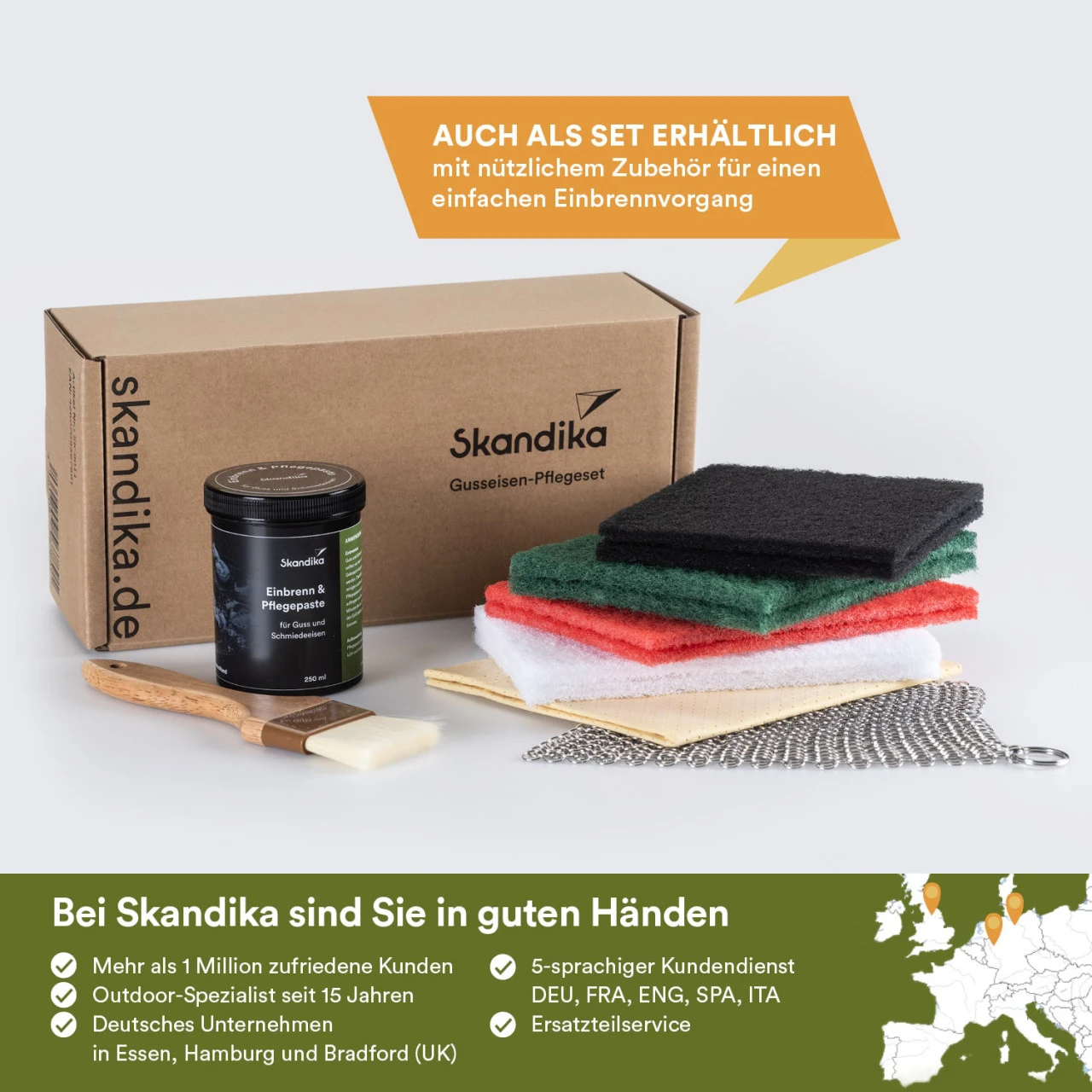 Die Einbrenn- und Pflegepaste von Skandika ist perfekt für die Anwendung bei unbeschichteten, nicht emaillierten Skandika Dutch Oven und kann ebenfalls bei anderen Guss- und Schmiedeeisenprodukten, wie z.B. Pfannen und Woks, Grillrosten und -zubehör, Brätern usw. zum Einsatz kommen.