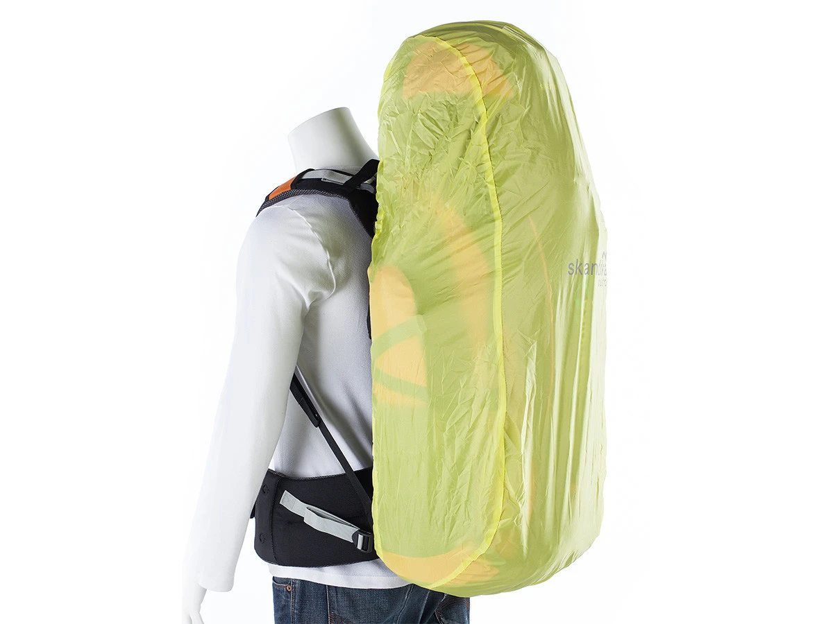 - Regenhülle integriert im Rucksackboden: signalgelb mit reflektierenden Elementen