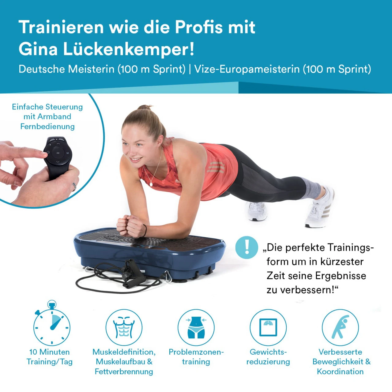 Komfortgröße, Komfortpreis, Komfortausstattung. Die Vibrationsplatte V1 twin engine überzeugt durch eine große Trittfläche und Bluetooth-Technologie bei schmalem Kostenaufwand. 10 Minuten täglich genügen, um die Ausdauer zu steigern, Gewicht zu reduzieren und Muskeln zu kräftigen. Dabei liegt die Betonung auf „und“, denn während man hier nur ein Gerät nutzt, muss man im Studio für die einzelnen Partien und einen vergleichbaren Trainingseffekt auf verschiedenen Geräten trainieren. Für eine individuell abgestimmte Trainingseinheit stehen 99 Geschwindigkeitsstufen in 5 Programmen und einem manuellen Modus zur Verfügung. Der Clou: Die beiden Motoren lassen sich unabhängig voneinander ansteuern, sodass für die oszillierenden und die linearen Schwingungslevel je 99 Trainingsstufen gewählt werden können. Die Bluetooth-Lautsprecher spielen dazu die Lieblingsmusik ein – einfach steuerbar über die einzigartige Armband-Fernbedienung. Die Trainingsgurte machen das Training abwechslungsreich und ermöglichen zusätzliche Übungen. So wird die Vibrationsplatte V1 zum vielseitigen Trainingsgerät mit einem hervorragenden Preis-Leistungsverhältnis.