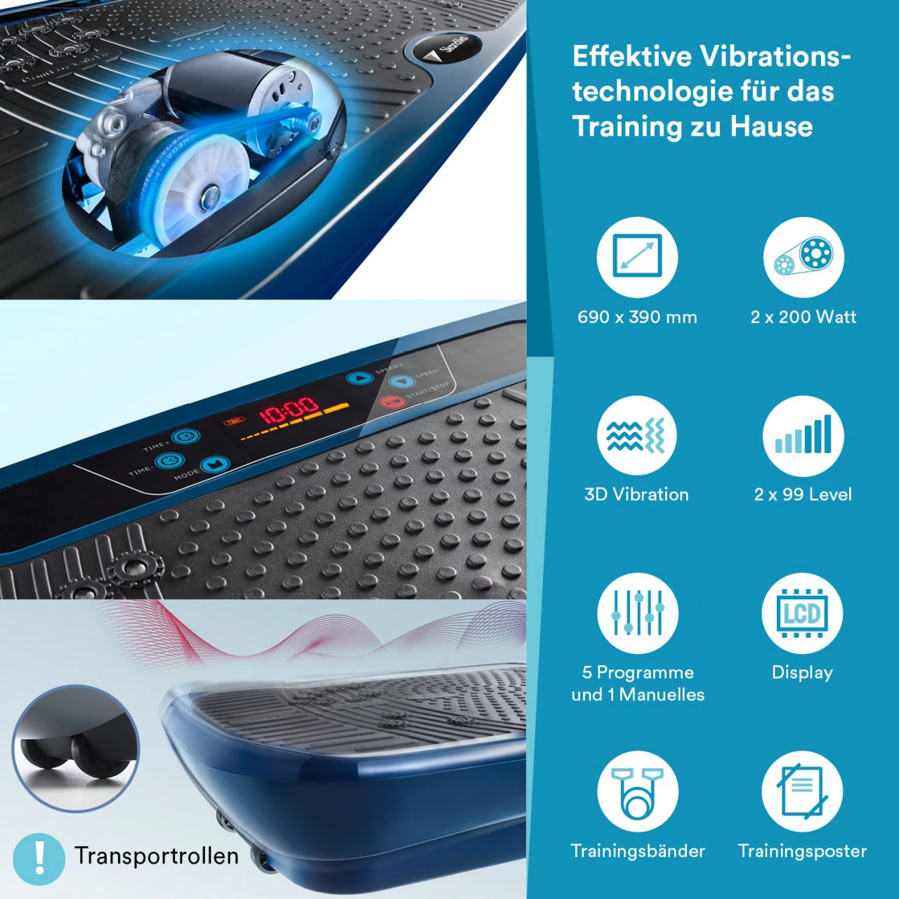 2 Kraftvolle Motoren, 3D-Vibrationen, verstellbare Zugbänder, Armband-Fernbedienung, 2 x 99 Trainingsstufen, 6 Programme, Bluetooth-Lautsprecher, Vibro Shaper