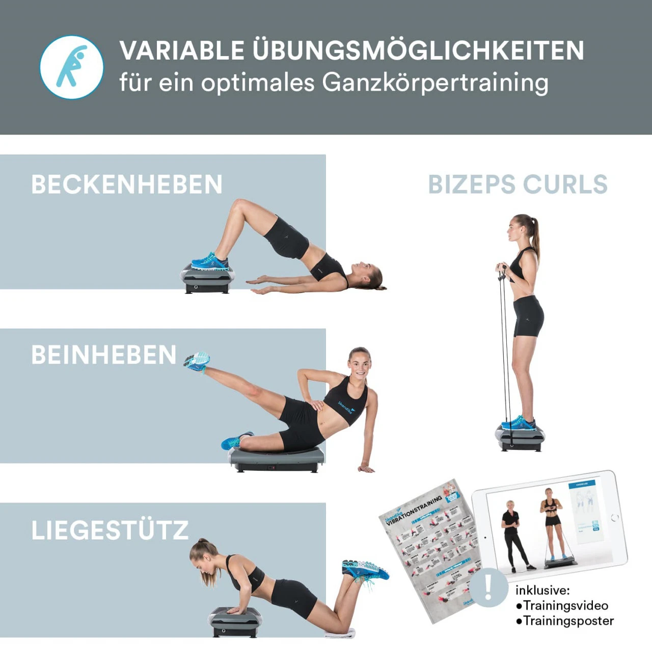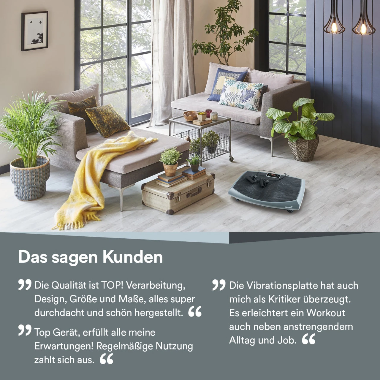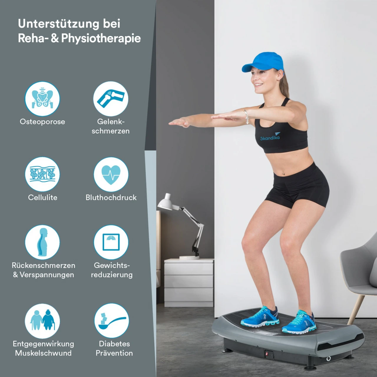 Um ein effektives Ganzkörpertraining zu Hause durchzuführen benötigt man also keinen voll ausgestatteten Fitnessraum mehr. Kurzes intensives Training ist der Schlüssel zum Erfolg. Täglich mit Hilfe des mitgelieferten Posters die Übungen durchführen und in kürzester Zeit die Ziele erreichen. Egal ob Muskeldefinition, Problemzonentraining, Hautstraffung, Fettverbrennung oder eine verbesserte Beweglichkeit. Alles ist möglich und sogar noch viel mehr. Nicht nur im Spitzensport wird die V2000 genutzt – auch zu Therapie- und Rehabilitationszwecken wird die Vibrationsplatte eingesetzt. Osteoporose, Bluthochdruck oder Diabetes sind nur ein paar Krankheitsbilder, denen vorgebeugt oder welche gelindert werden können. Die V2000 ist perfekt geeignet für jedes Alter, egal ob Anfänger oder Profi. Je nach Trainingslevel kann die Intensität gesteuert werden. Mit Hilfe der 3 manuellen und 3 computergesteuerten Trainingsprogramme kann das Training individuell angepasst werden. Dabei behältst du durch die Smart LEDs immer im Blick in welcher Trainingsstufe du dich gerade befindest. Zudem zeigt das große intuitive Touchdisplay deine Daten wie Trainingszeit und Programm an. Neben der Steuerung des Touchdisplays kann die V2000 auch durch die mitgelieferte Fernbedienung gesteuert werden. Wir haben trotz der großen Trainingsfläche darauf geachtet, dass die V2000 auch in kleineren Wohnungen Ihren Platz findet und praktikabel ist. Die praktischen Tragegriffe ermöglichen die Platte schnell und einfach zu verstauen.