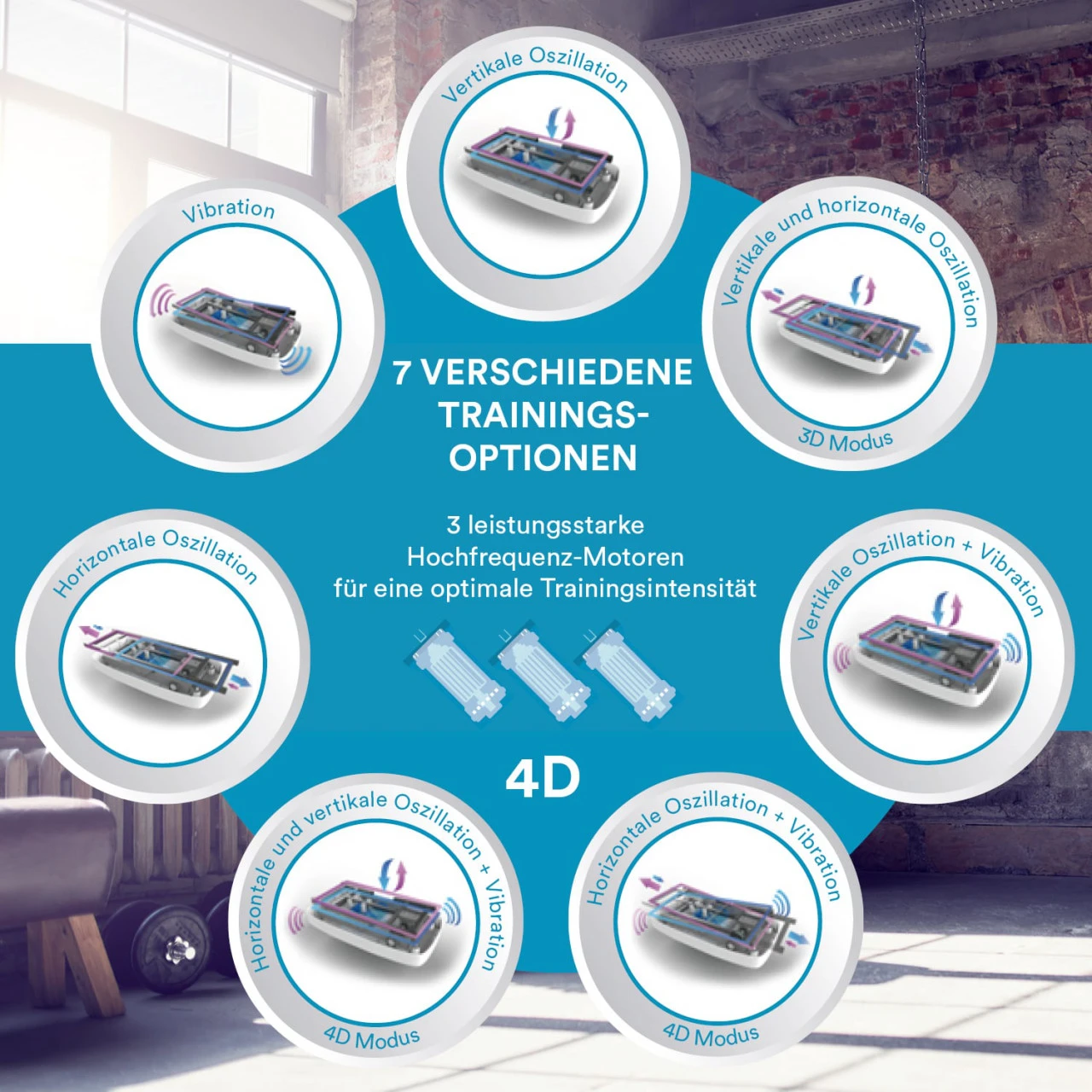 3 voreingestellte Trainingsprogramme und ein manuelles Programm sorgen für effektive Workouts für Fortgeschrittene sowie weniger geübte Nutzer. Die individuell einstellbaren Kombinationen aus horizontaler und vertikaler Oszillation, entweder mit oder auch ohne Vibration, bieten für jedes Programm insgesamt 7 verschiedene Workout-Optionen. Werden die im Lieferumfang enthaltene Trainingsbänder mitbenutzt, ergeben sich weitere Möglichkeiten, um die Oberkörpermuskulatur ebenfalls effektiv in das Workout miteinzubeziehen.