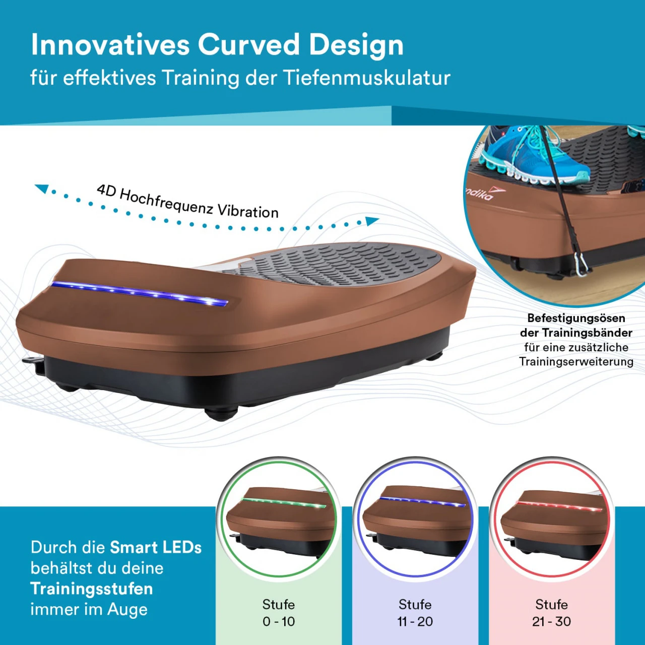 Egal ob für Muskeldefinition, Muskelaufbau und Fettverbrennung, für Problemzonentraining und Gewichtsreduzierung oder für allgemeine Fitness, Beweglichkeit und Koordination, die V2500 ist ein Multitalent, wenn es um effektives Vibrationstraining geht. Kurzes intensives Training ist der Schlüssel zum Erfolg. Das innovative Curved Design mit der besonders großen Anti-Rutsch-Oberfläche sieht nicht nur optisch top aus, sondern sorgt zudem für ein effektives Training der Tiefenmuskulatur. Bei regelmäßiger Nutzung zeigen sich positive Ergebnisse bei nur 10 Minuten Training täglich.