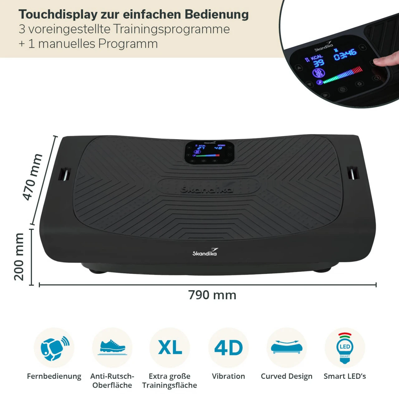 Die Skandika Vibrationsplatte V3000 verwendet ein neuartiges Antriebs- und Motorensystem mit 3 leistungsstarken Hochfrequenz-Motoren (2x 200 Watt + 1x 80 Watt), das Oszillation, Vibration und Mikro-Vibration effektiv miteinander vereint. Die Kombination aus linearen, vertikalen und oszillierenden Schwingungen sowie die 3 computergesteuerten Trainingsprogramme und 60 Intensitätsstufen ermöglichen ein auf den Trainierenden individuell abgestimmtes Training, ob Anfänger oder geübter Sportler.