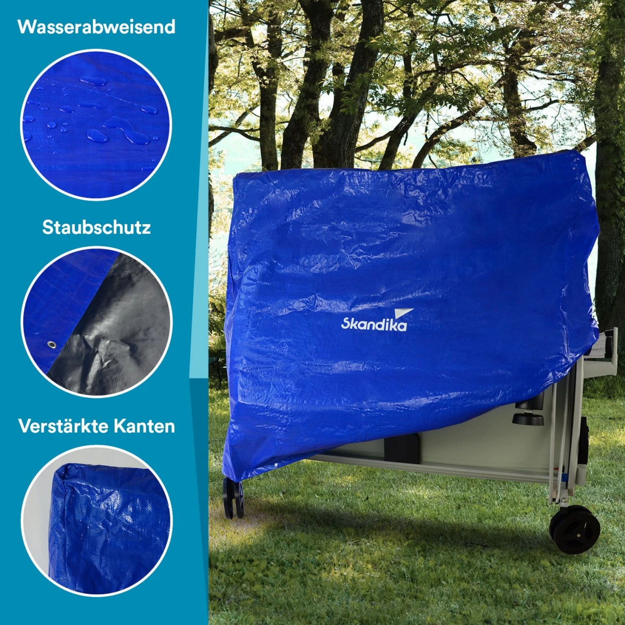 Schütze deine Skandika Outdoor Tischtennisplatte, wenn sie nicht verwendet wird, durch eine Abdeckung aus hochwertigem und strapazierfähigem 100% Polyethylen-Kunststoff. Dank des schwerlastigen Fasermaterials hält diese Abdeckung bombensicher – auch bei Wind und Wetter. Die Abdeckung schützt deine Skandika Tischtennisplatte vor Regen, Sonne, Schmutz und Schnee. Die Abdeckplane ist außerdem leicht zu reinigen – eine kurze Handwäsche und anschließendes Trocknen in der Sonne genügen.