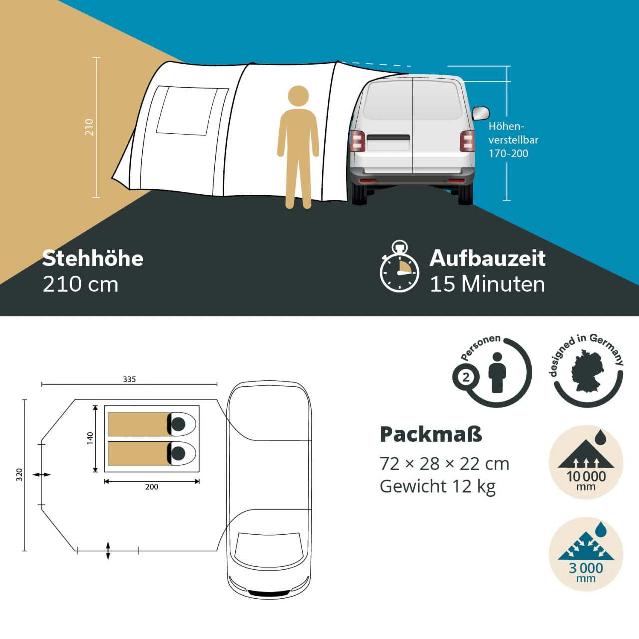 Das Camper Tramp ist ein großzügiges Busvorzelt, das einem Kastenwagen oder Minivan mit seitlicher Schiebetür und einer Höhe zwischen 170 und 200 cm für Campingabenteuer mehr Platz bietet. Es muss nämlich nicht immer ein großes Wohnmobil sein.