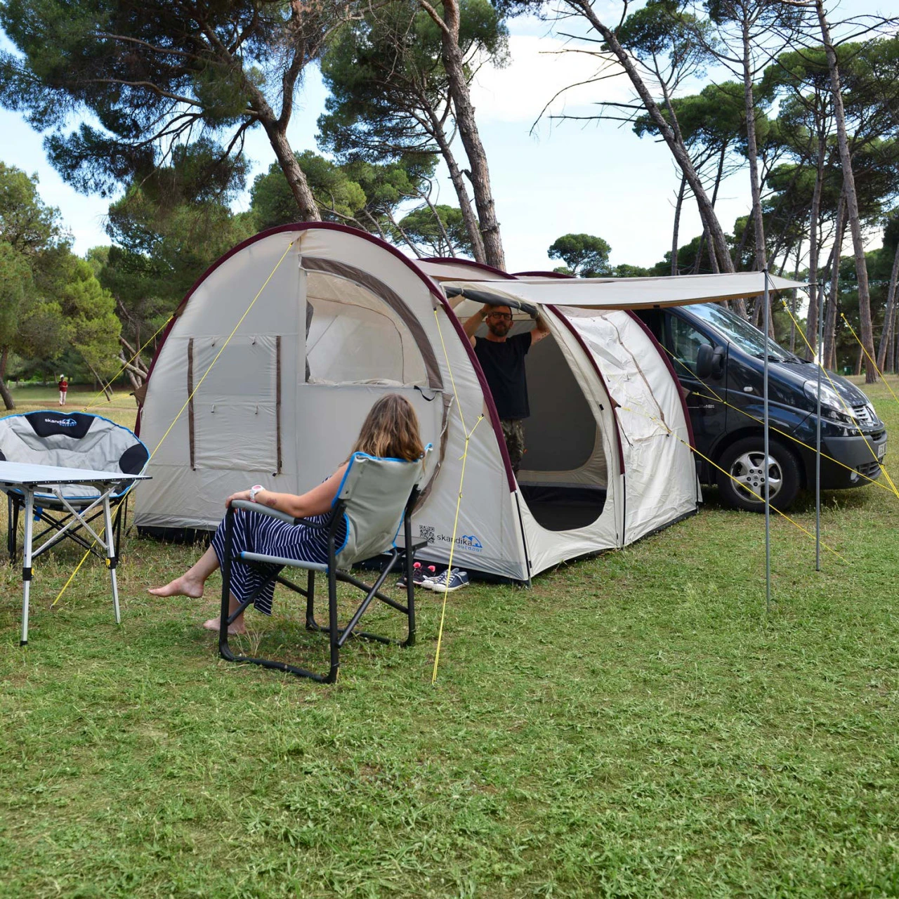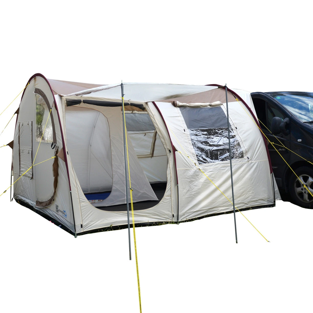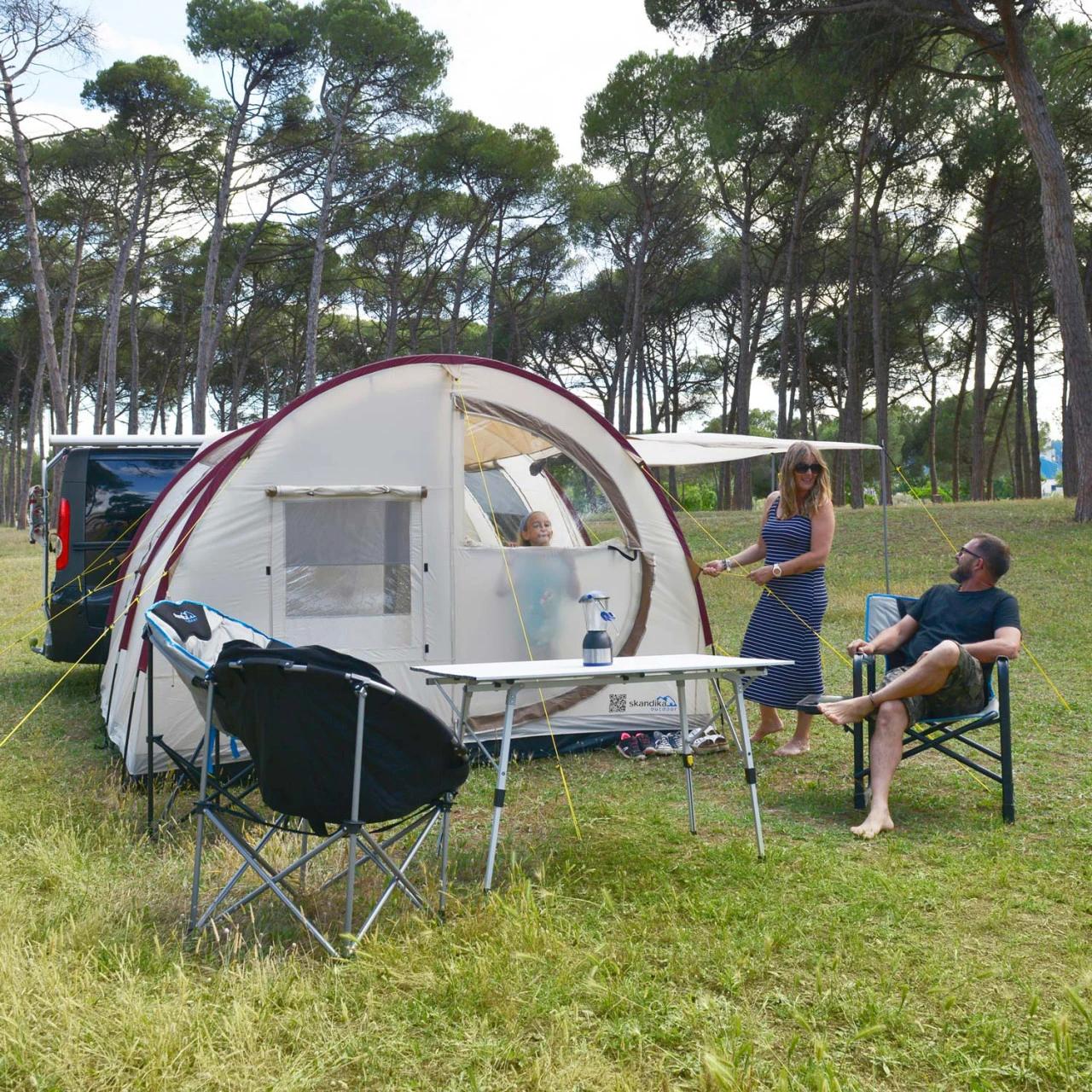 Bei Bedarf lässt sich der Innenraum des Zeltes mithilfe von einer Innenkabine mit eingenähten Böden aufteilen. Natürlich ist das Material atmungsaktiv, So entsteht ganz unkompliziert ein gemütlicher Schlafplatz für zwei Personen. Weil das Esbjerg ganze 210 cm hoch ist, haben auch große Menschen genug Bewegungsfreiheit. Zählt man den Schleusenbereich zum Fahrzeug mit, hat das Zelt insgesamt drei Eingänge. Drei Fenster aus Netzmaterial im oberen und durchsichtiger Folie im unteren Bereich schaffen ein luftiges Innenraumklima und ein freundliches Ambiente. Bei nassem Wetter schützt euch das wasserfeste Zeltmaterial. Also, genießen Sie Ihre Ferien zusammen.