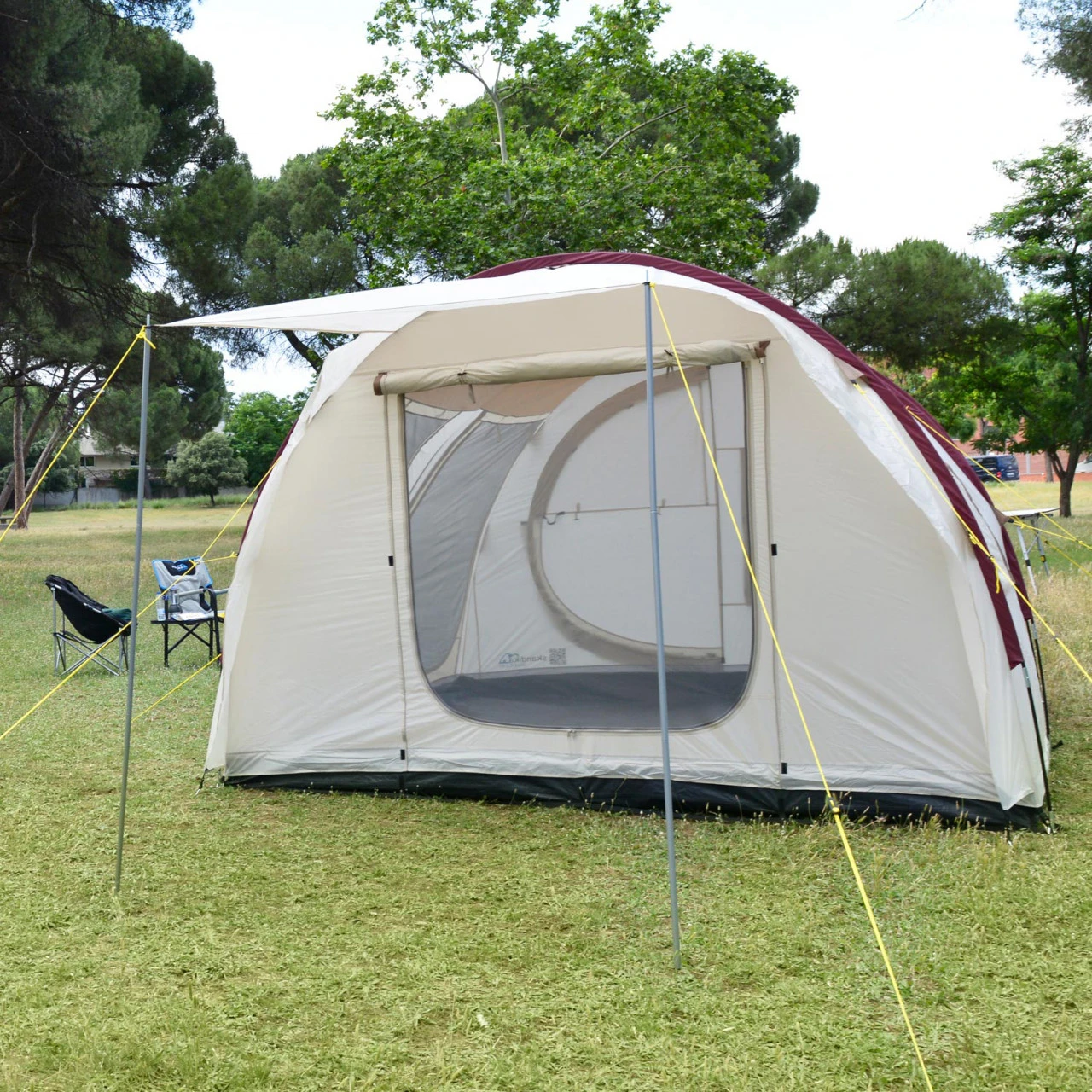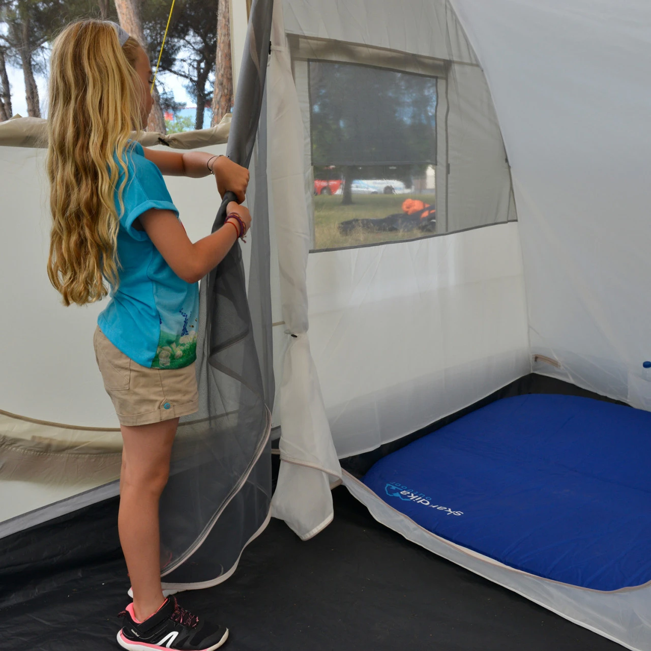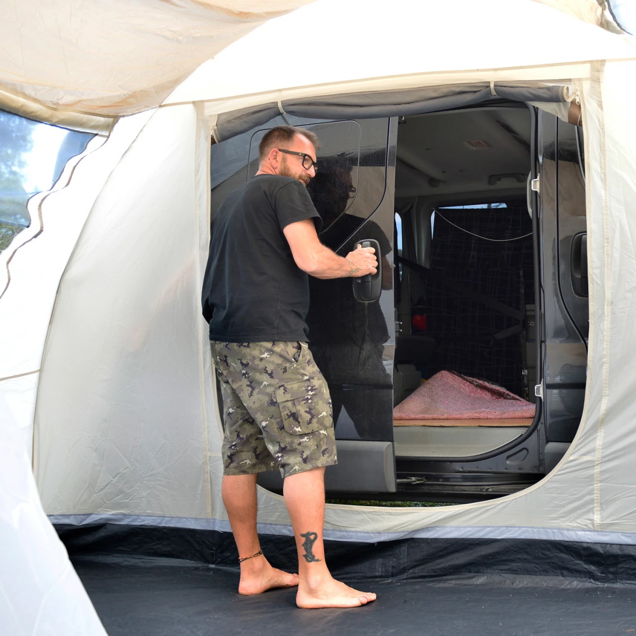 Bei Bedarf lässt sich der Innenraum des Zeltes mithilfe von einer Innenkabine mit eingenähten Böden aufteilen. Natürlich ist das Material atmungsaktiv, So entsteht ganz unkompliziert ein gemütlicher Schlafplatz für zwei Personen. Weil das Esbjerg ganze 210 cm hoch ist, haben auch große Menschen genug Bewegungsfreiheit. Zählt man den Schleusenbereich zum Fahrzeug mit, hat das Zelt insgesamt drei Eingänge. Drei Fenster aus Netzmaterial im oberen und durchsichtiger Folie im unteren Bereich schaffen ein luftiges Innenraumklima und ein freundliches Ambiente. Bei nassem Wetter schützt euch das wasserfeste Zeltmaterial. Also, genießen Sie Ihre Ferien zusammen.