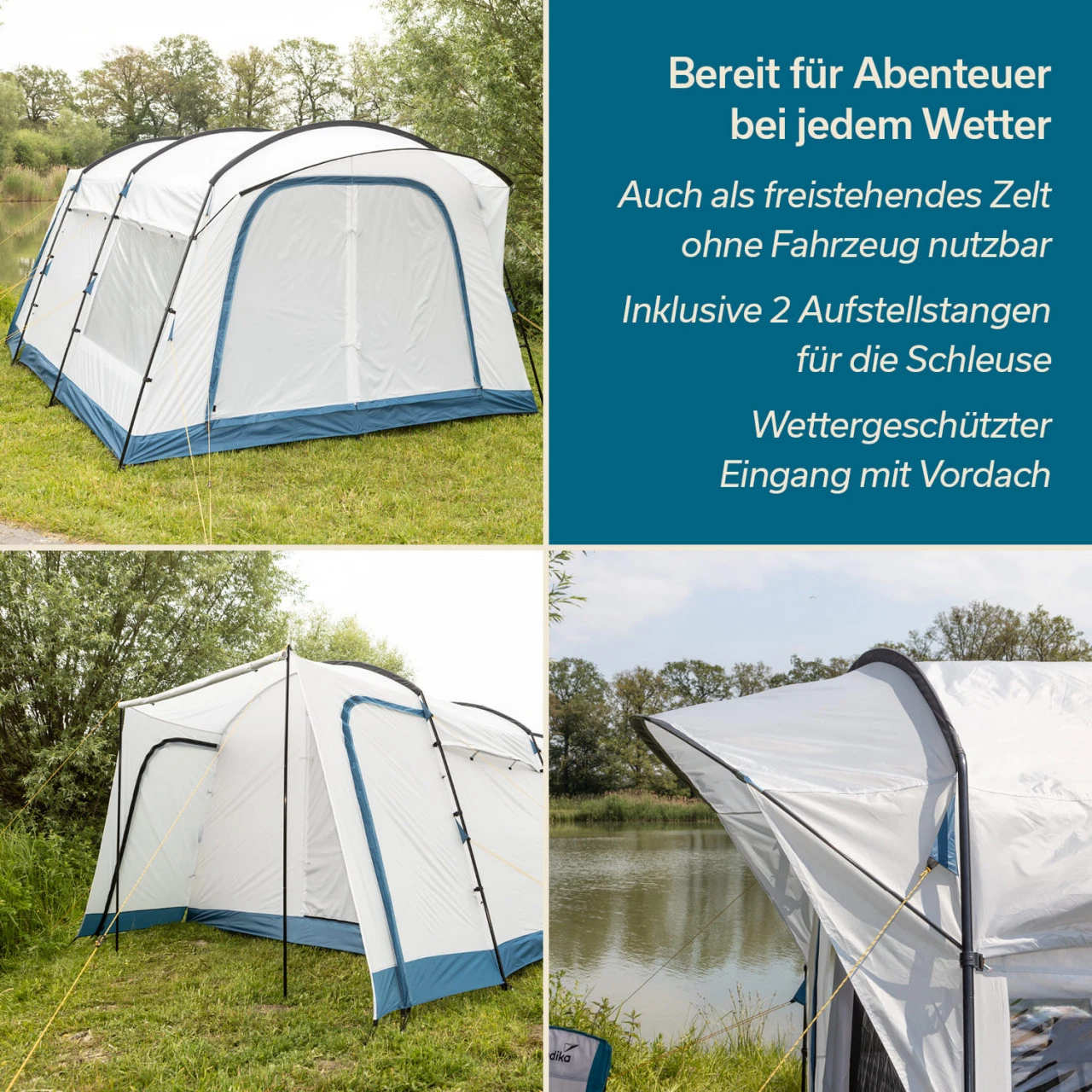 Das hübsche Vejers Travel in den Strandfarben hellgrau und blau ist ein Vorzelt für Minivans, Camper und Kastenwagen, die eine seitliche Schiebetür haben. Das Zelt schließt mit der praktischen Schleuse direkt am Auto ab und erweitert das Platzangebot des Fahrzeugs erheblich. Der Bereich der Schleuse kann zudem als wettergeschützter Abstellplatz oder zusätzlicher Raum genutzt werden. Die Eingangstüren an den beiden Seiten des Schleusenbereichs ermöglichen einen schnellen Zugriff auf persönliche Gepäckstücke, sowie auf die Schiebetür des Autos – ohne zuerst durch das ganze Zelt gehen zu müssen. Ein sehr praktisches Detail.