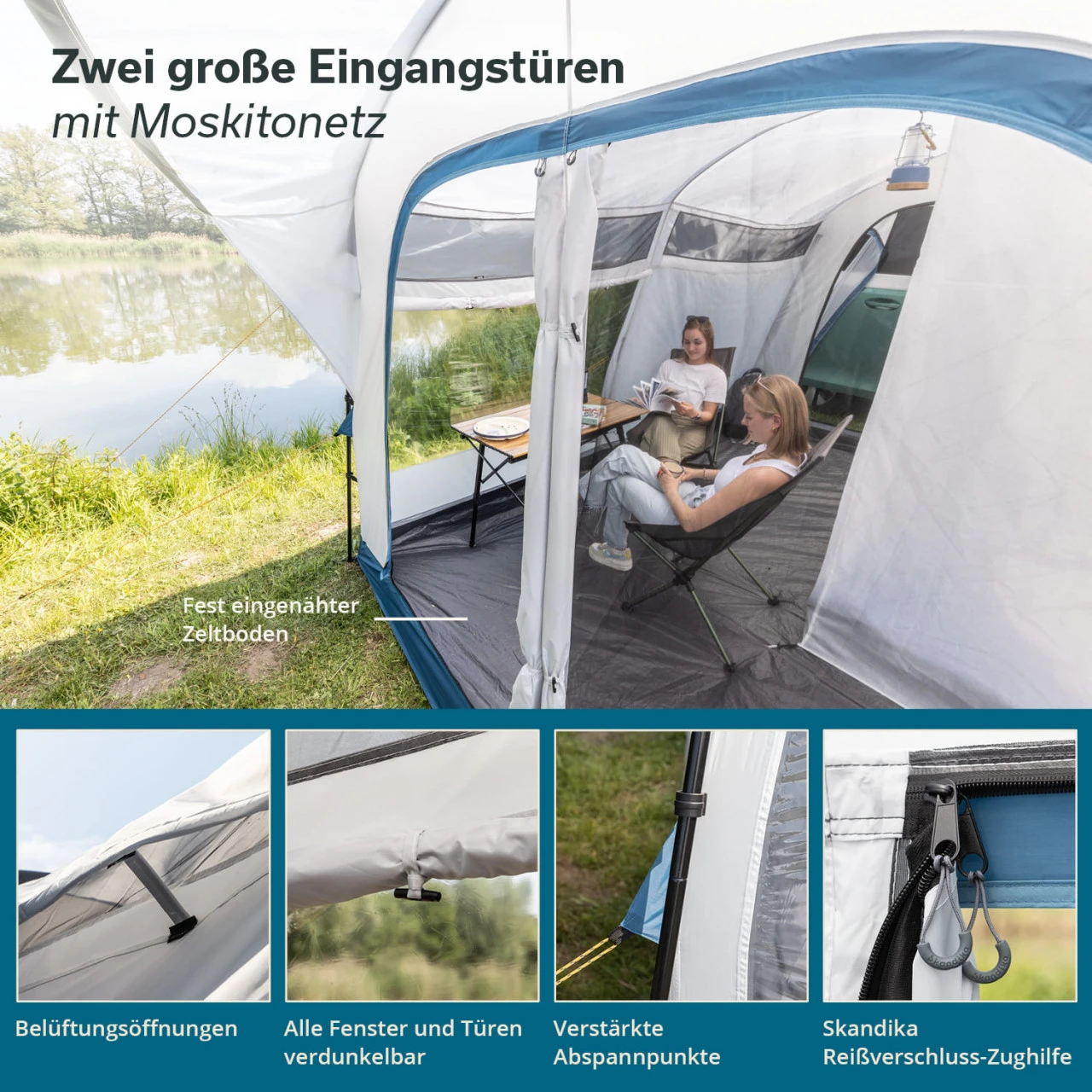 Im großzügigen Wohnbereich des Zeltes lassen zwei Panoramafenster aus Folie ebenfalls viel natürliches Licht ins Zelt, können jedoch bei Bedarf für mehr Privatsphäre von innen blickdicht abgedeckt werden. Vier große, wetter- und insektengeschützte Ventilationsöffnungen im oberen Bereich der Zeltwände sorgen für eine gute Luftzirkulation und ein angenehmes Innenzeltklima, selbst bei geschlossenen Türen. Der fest eingenähte Zeltboden des Wohnbereichs schützt außerdem vor lästigen Krabbeltieren und vor Zugluft.
