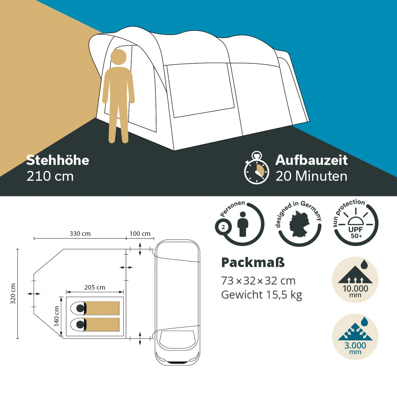 - Material (Außenzelt): 190T Polyester PU beschichtet