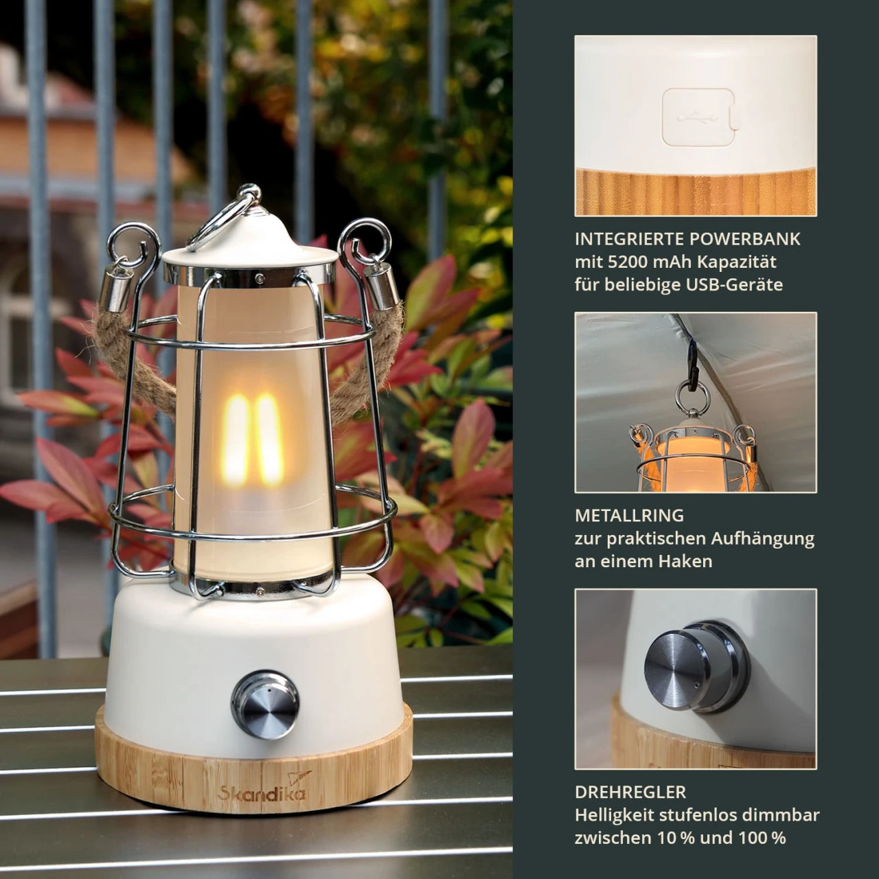 Das Hanfseil als auch der Bambussockel lassen die Laterne einerseits besonders stylisch aussehen, begünstigen andererseits aber auch ihre Langlebigkeit. Zudem ist sowohl Hanf als auch Bambus ein nachwachsender, nachhaltiger und ressourcenschonender Werkstoff.