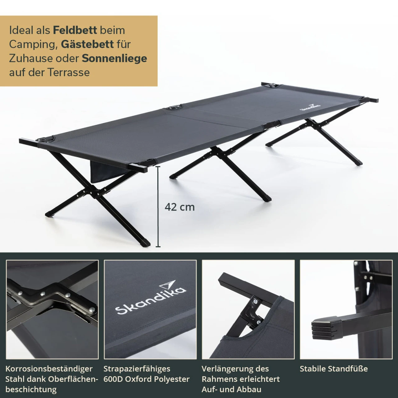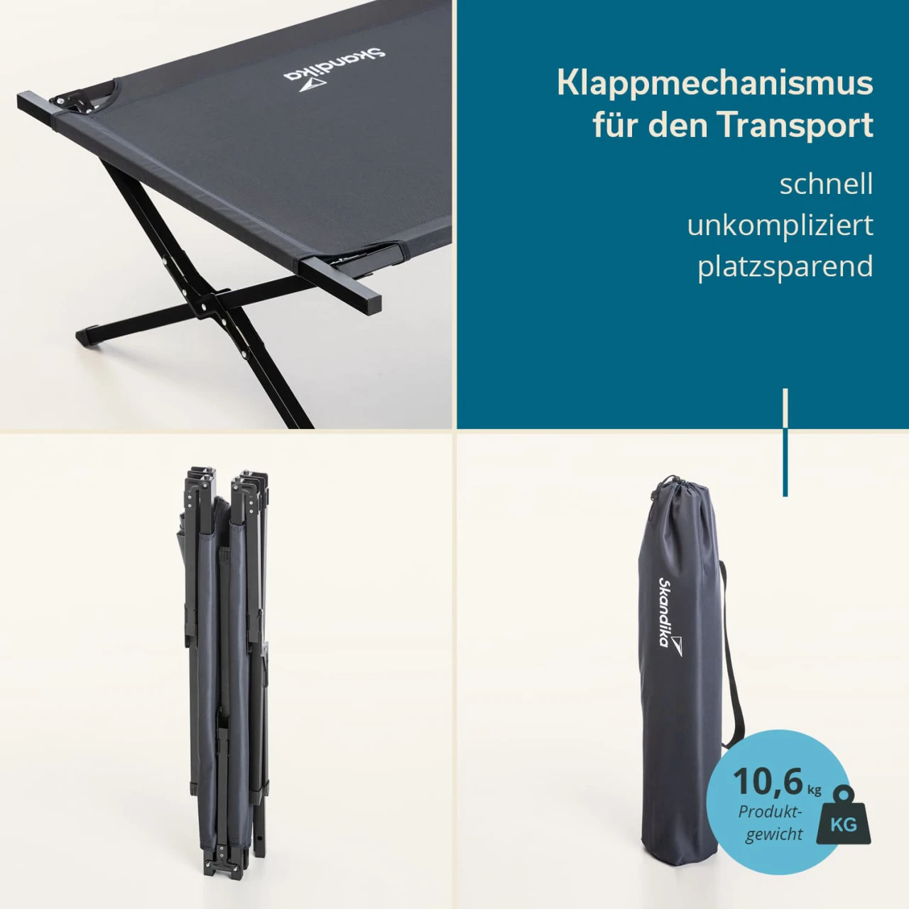 Die Skandika Campingliege Mutenia vereint Komfort, Stabilität und Praktikabilität in einem einzigen Produkt. In Punkto Komfort bietet die Liege eine großzügige Liegefläche von 210 x 75 cm und eine angenehme Höhe von 42 cm, die ein komfortables Aufstehen ermöglicht. Dies macht sie zur optimalen Wahl für alle, die Wert auf einen erholsamen Schlaf legen.