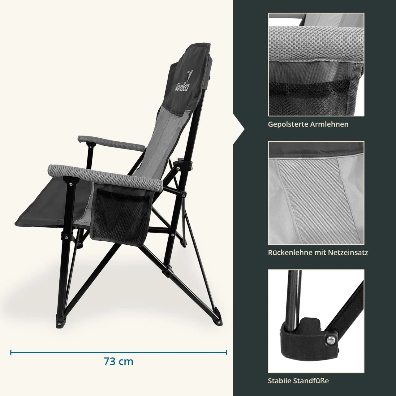 Die angenehm große Sitzfläche und die weich gepolsterten, abgerundeten Armlehnen laden zum Verweilen ein, wobei der eingenähte Netzeinsatz in der Rückenlehne für zusätzlichen Komfort sorgt, selbst an heißen Tagen. An der linken Armlehne ist eine mit Netz bespannte Organizer-Tasche angebracht, damit Kleinigkeiten wie Handy und Sonnenbrille stets griffbereit sind. Die schwenkbare Getränkehalterung an der rechten Seite ist ebenfalls ein sehr praktisches Extra.