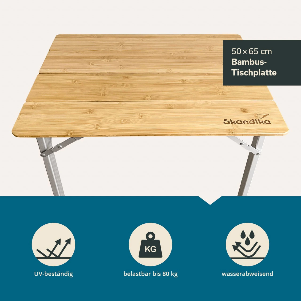 Camping geht auch stylisch. Die attraktive und umweltfreundliche Bambus-Tischplatte verleiht dem Falttisch Tolja ein natürliches Aussehen und zugleich einen besonders eleganten und hochwertigen Look. So werden beim Camping keinerlei Abstriche gemacht, was das Design angeht.