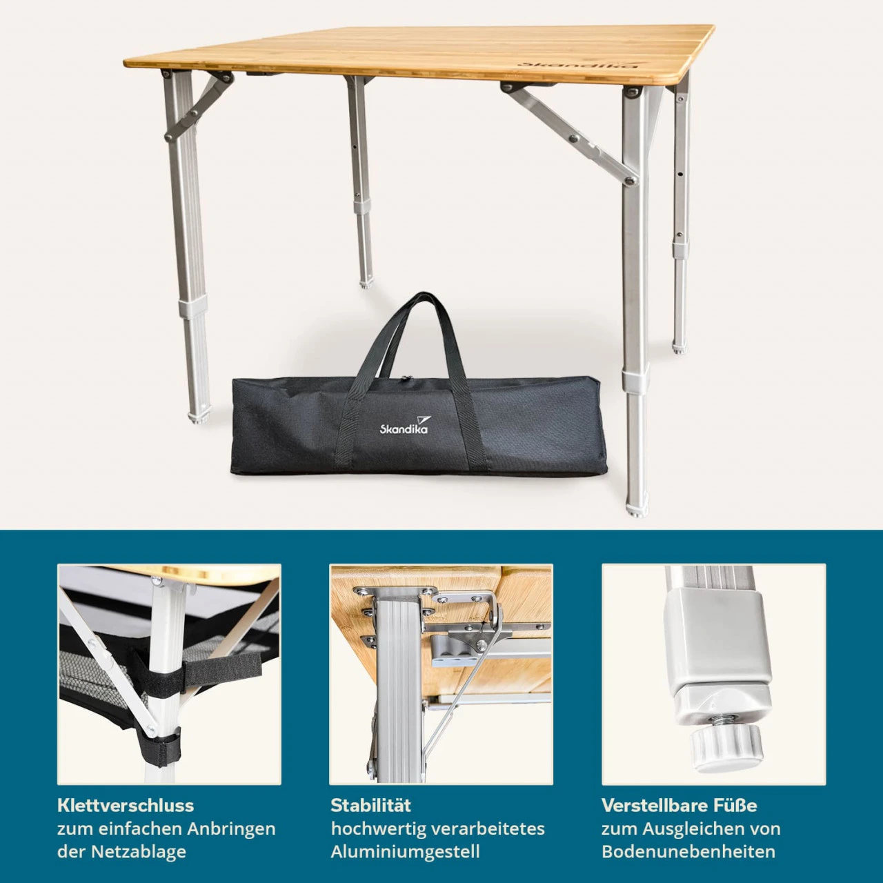 Ein stabiler Tisch ist unverzichtbar für jede Art von Outdoor-Abenteuern. Ob als Esstisch, als Abstellfläche für Geschirr und Kochutensilien oder als Karten- oder Basteltisch für einen gemütlichen Abend mit Freunden oder Spiele mit den Kindern, der Skandika Tolja ist immer eine gute Wahl.