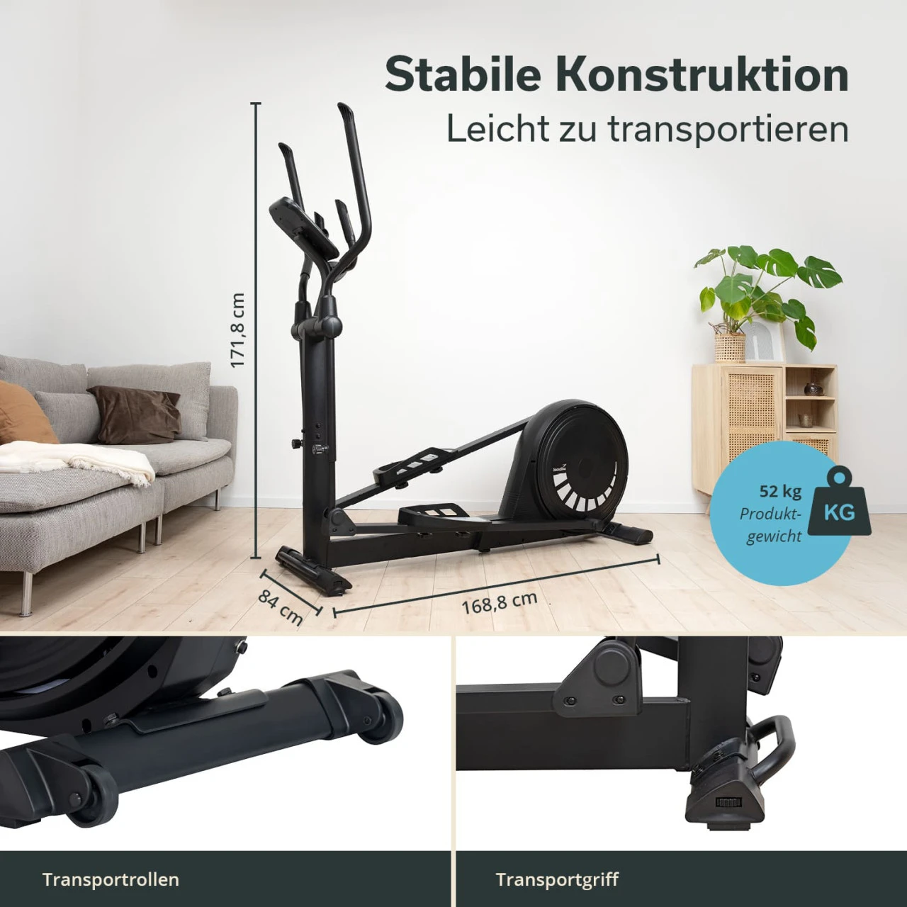 - Pulssensoren an den Handgriffen, große Pedale, Tablet-Halterung, integrierte Transportrollen
