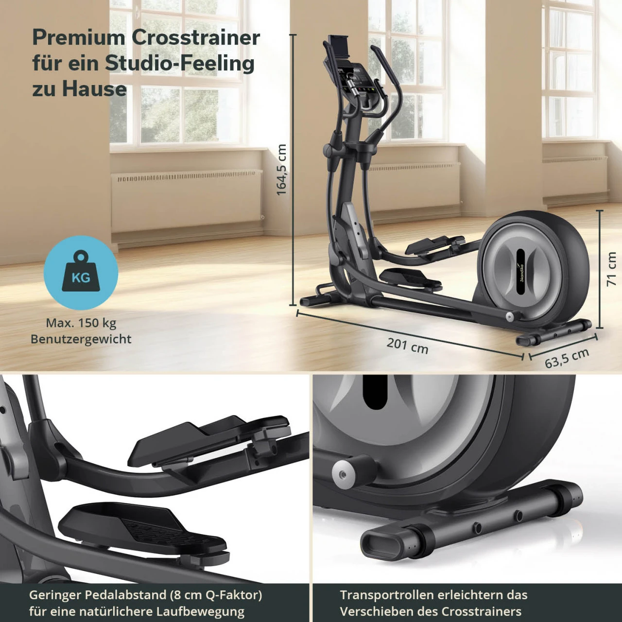 Der Crosstrainer ist mit einem integrierten Trainingscomputer ausgestattet. Das LED-Display zeigt eine Vielzahl von Leistungswerten an, darunter Tempo, Zeit, Distanz, Umdrehungen, Kalorien, Puls und Watt. Die Bluetooth-Schnittstelle ermöglicht eine drahtlose Verbindung zu anderen Geräten und erweitert so die Trainingsmöglichkeiten.