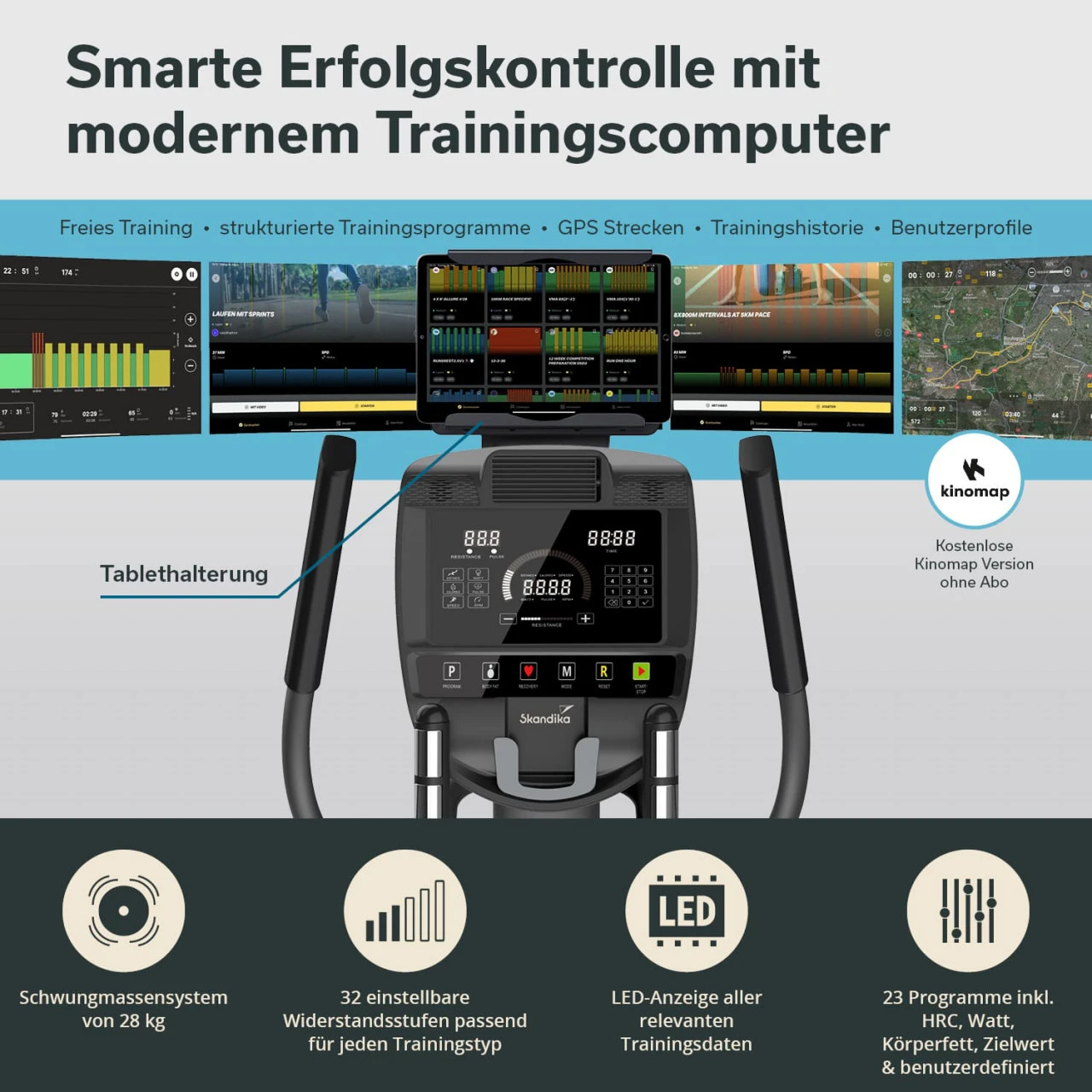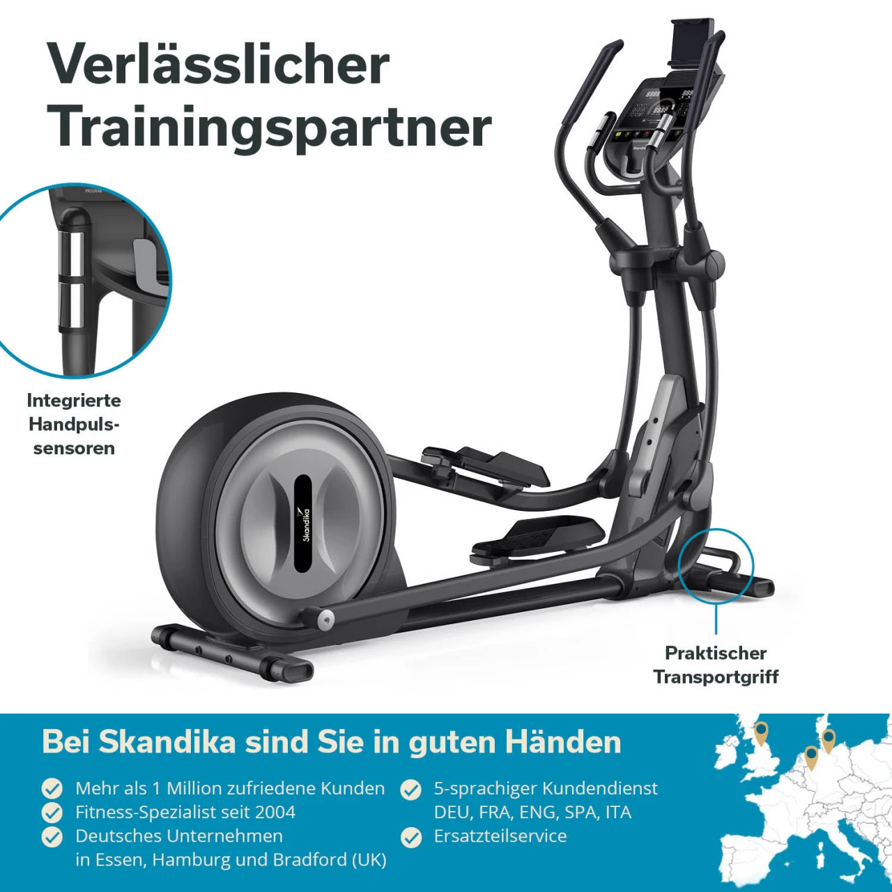 Der Skandika Crosstrainer Carbon P-28 R bietet mit seinem hinten platzierten Schwungrad und dem geringen Q-Faktor von 8 cm optimale Bedingungen für ein gelenkschonendes Training mit flüssigen Laufbewegungen.