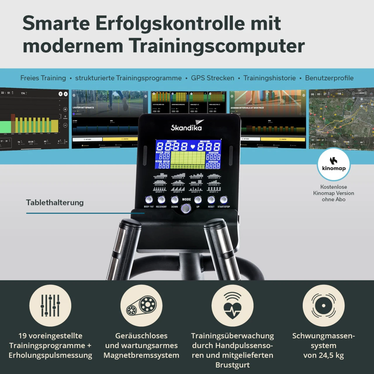 19 voreingestellte Programme sorgen für ein abwechslungsreiches Training, das Anfänger und Fortgeschrittene gleichermaßen zufriedenstellt. Während des Trainings werden Körperfettanteil und Herzfrequenz angezeigt und ein Recovery-Modus überwacht die Erholungs- und Regenerationsphase.