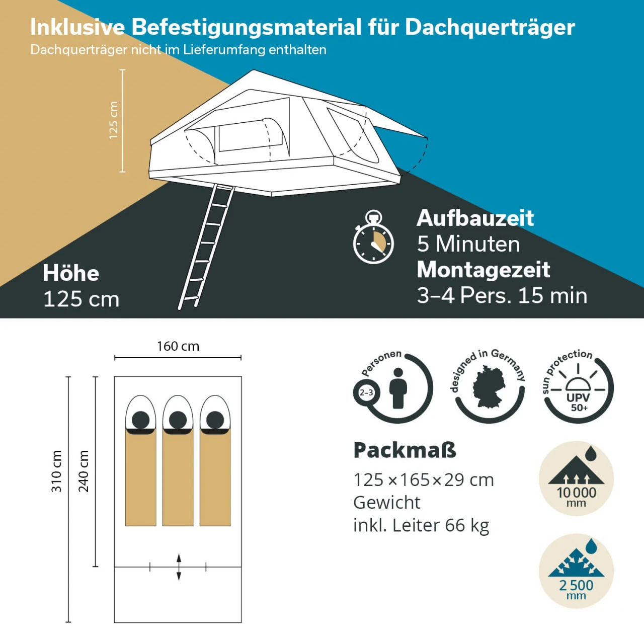 - Material Dachzelt: 420 D Ripstop Polyester, UPF 50+