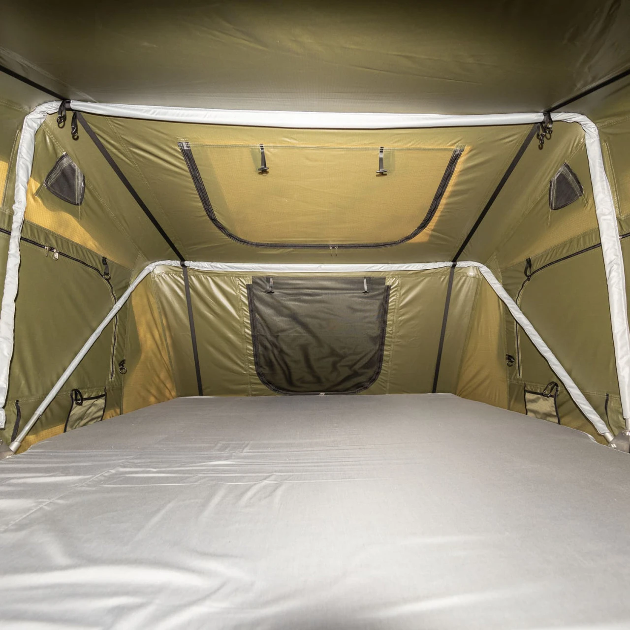 Damit kein Dreck in das Zelt gelangt, können zwei praktische und wetterfeste Aufbewahrungstaschen vor dem Eingang in die Kederleiste eingehängt werden, sodass das Schuhwerk ausgezogen werden und sicher und trocken draußen in der Tasche verweilen kann. Beim Zusammenpacken des Dachzelts können vier Schnüre über die Breite des Innenraums gespannt werden, die das Einpacken in das Cover erleichtern, indem sie dafür sorgen, dass die Zeltwände beim Zusammenfalten nach innen gezogen werden.