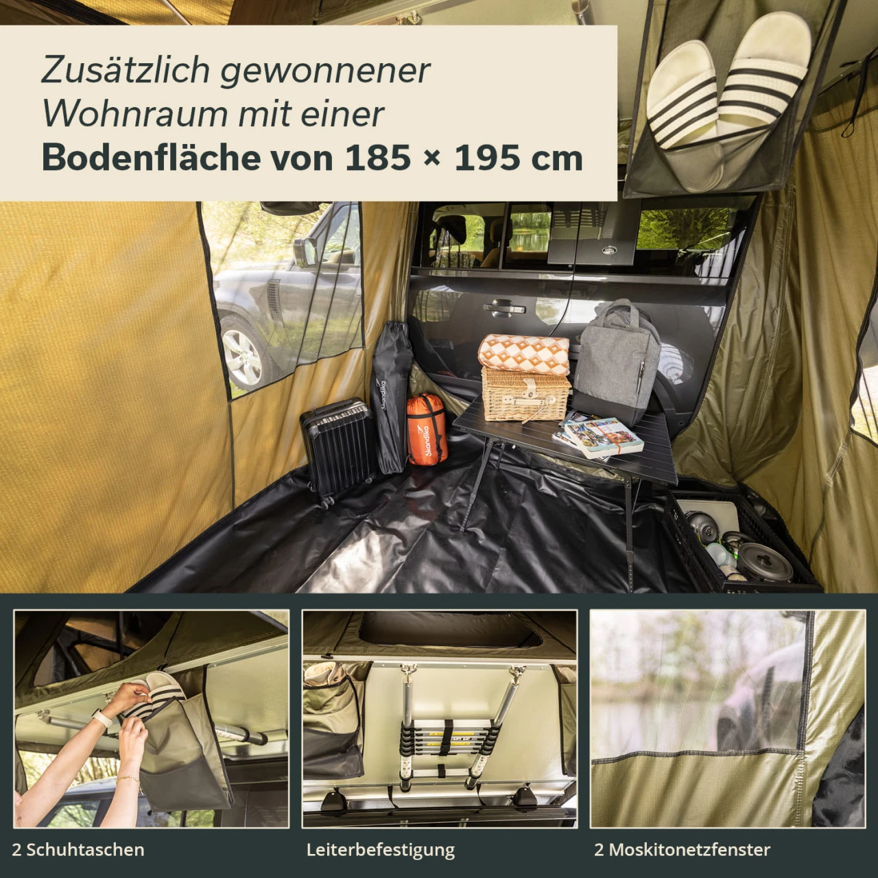 Bei dieser Ausführung des Dachzeltes ist ein 190 cm hohes Vorzelt im Lieferumfang enthalten. Es dient als gemütlicher Rückzugsort bei schlechtem Wetter und bietet einen trockenen, wettergeschützten Platz für Gepäck und Campingmöbel. Das Vorzelt überdeckt den gesamten Bereich unterhalb des Zeltvorbaus und erlaubt, je nach Fahrzeugmodell, einen wettergeschützten Zugang zur Seitentür des Autos.