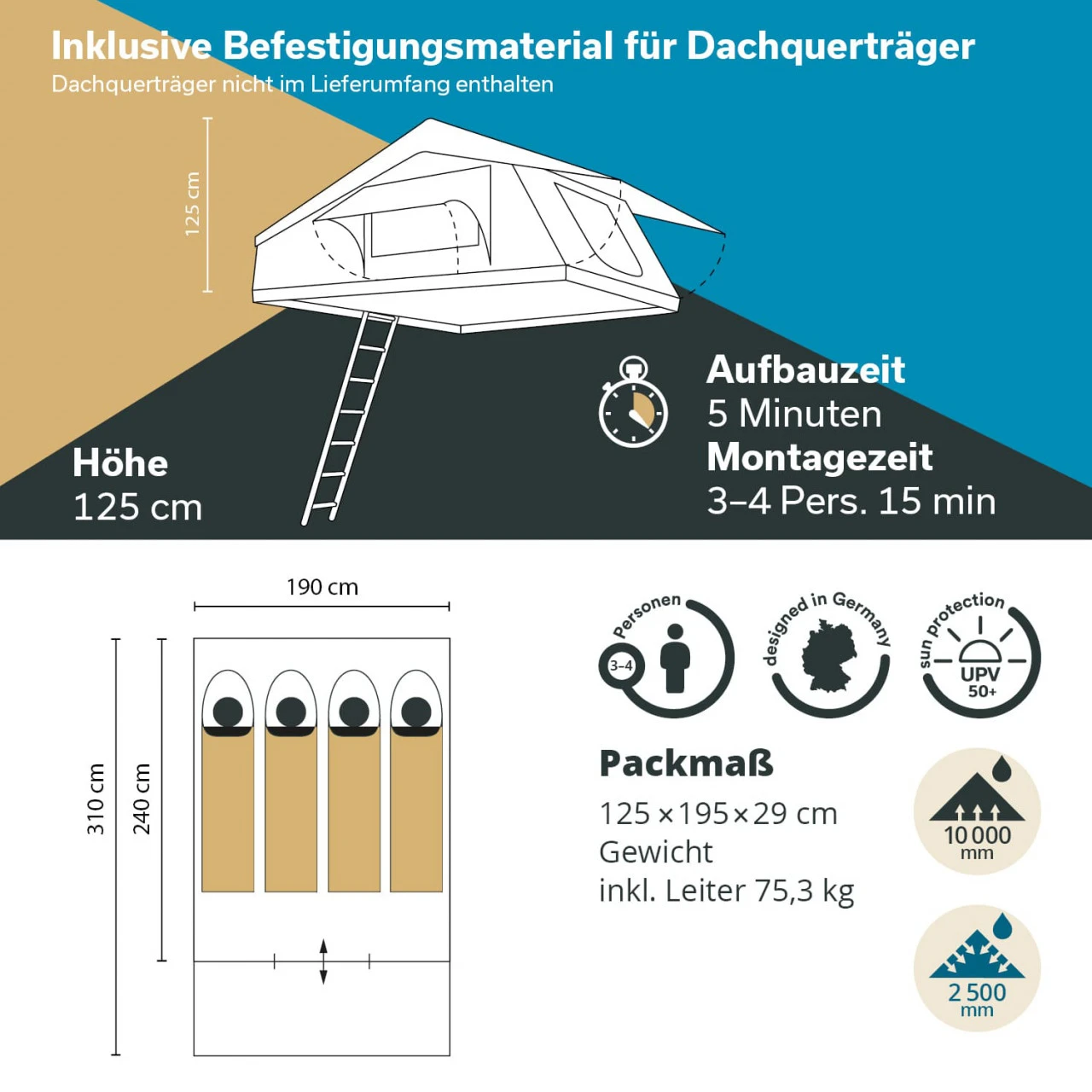 - Material Dachzelt: 420 D Ripstop Polyester, UPF 50+