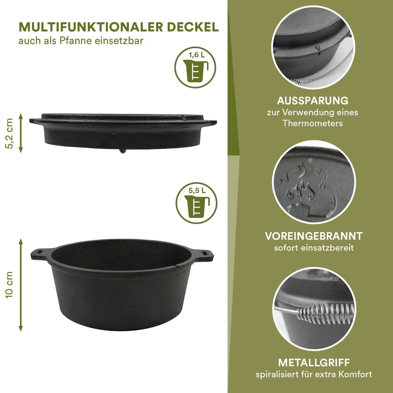 Nicht nur Klassiker wie Schichtfleisch gelingen in dem Skandika Dutch Oven perfekt. Auch Zimtschnecken, Brot oder Kuchen lassen sich hervorragend im Gusstopf zubereiten. Ob zum Kochen, Braten, Schmoren, Grillen, Frittieren, Dünsten oder Backen – der Topf machts möglich! Damit die Rezeptideen nicht so schnell ausgehen, ist ein umfangreiches Rezeptbuch im Lieferumfang jedes Flame Masters enthalten: das zweite Dutch Oven Rezeptbuch der Sauerländer BBCrew, welche mittlerweile echte YouTube-Stars der BBQ Szene sind, enthält zahlreiche neue Ideen für leckere Schmankerl und viele praktische Tipps rund um den Dutch Oven.