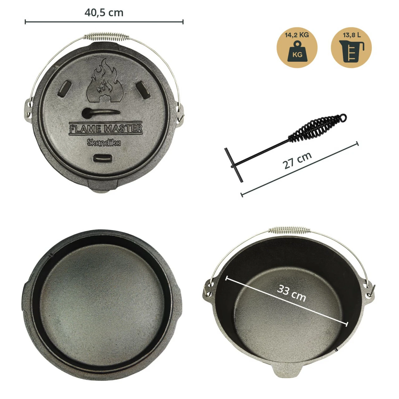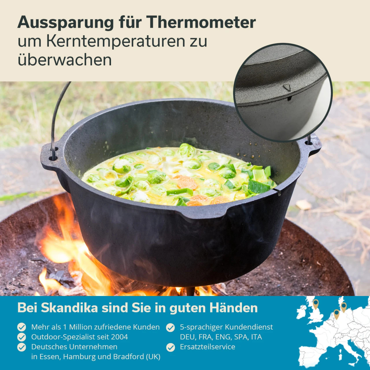 Bei den Skandika Flame Master Dutch Oven haben wir besonderen Wert auf die Materialstärke, geringe Gussfehler und eine gleichmäßige Bodenstärke gelegt, damit mit unseren Töpfen köstliche Speisen und Schmorgerichte zubereitet werden können. Das verwendete Gusseisen ist ausgesprochen dickwandig und hat deshalb hervorragende Wärmespeichereigenschaften. Eine Besonderheit des Dutch Oven ist, dass auf ihm auch glühende Kohle abgelegt werden kann und so auch Wärme von oben erzeugt wird. Das Ergebnis entspricht dann der allseitigen Wärmezufuhr in einem Ofen.