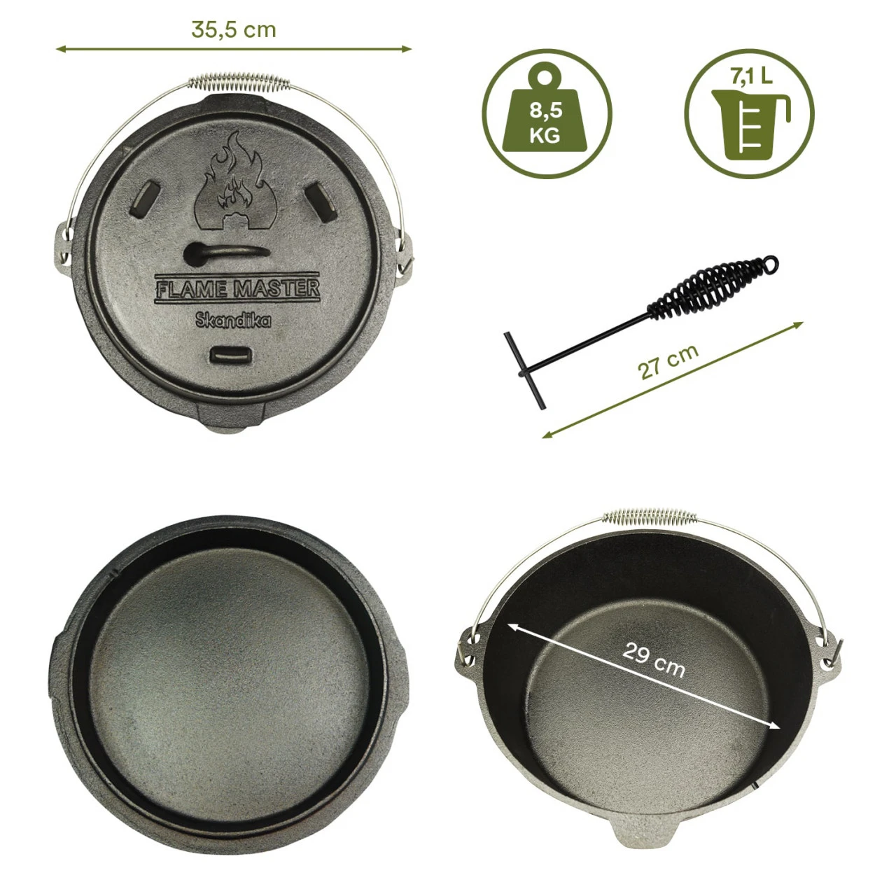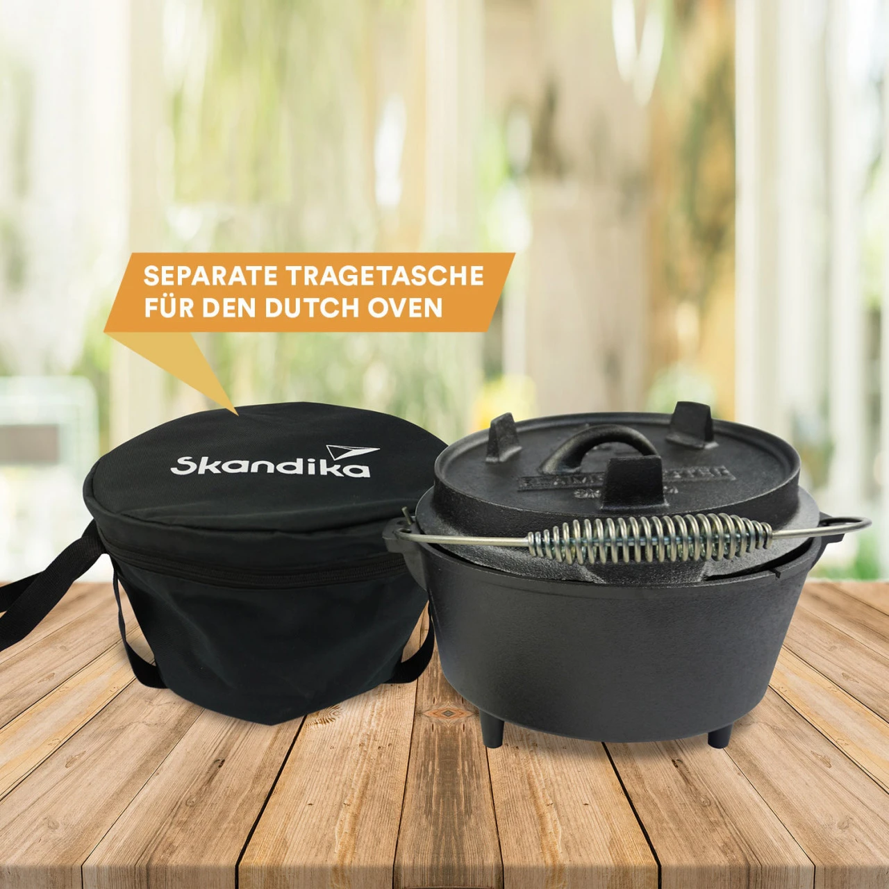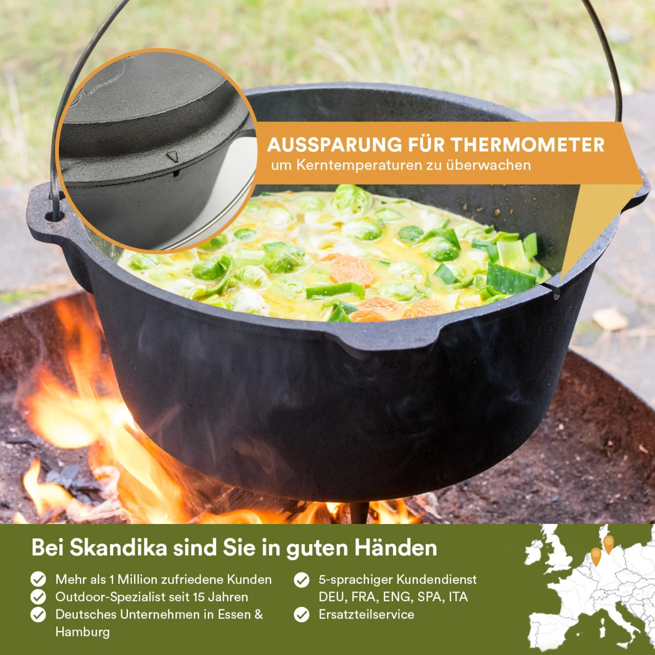 Bei den Skandika Flame Master Dutch Oven haben wir besonderen Wert auf die Materialstärke, geringe Gussfehler und eine gleichmäßige Bodenstärke gelegt, damit mit unseren Töpfen köstliche Speisen und Schmorgerichte zubereitet werden können. Das verwendete Gusseisen ist ausgesprochen dickwandig und hat deshalb hervorragende Wärmespeichereigenschaften. Eine Besonderheit des Dutch Oven ist, dass auf ihm auch glühende Kohle abgelegt werden kann und so auch Wärme von oben erzeugt wird. Das Ergebnis entspricht dann der allseitigen Wärmezufuhr in einem Ofen.