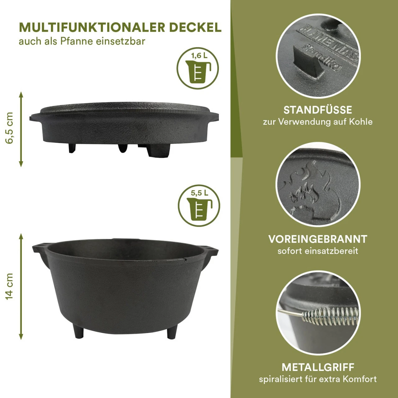 Alle Skandika Dutch Oven sind bereits voreingebrannt und können direkt verwendet werden. Durch die Füße können sie ohne ein extra Gestell mit Briketts beheizt werden. Der Deckel hat ebenfalls Füße und dient so zusätzlich als Pfanne. Mit dem praktischen Deckelheber kann der heiße Deckel während der Zubereitung sicher angehoben werden, um den Garfortschritt zu begutachten.