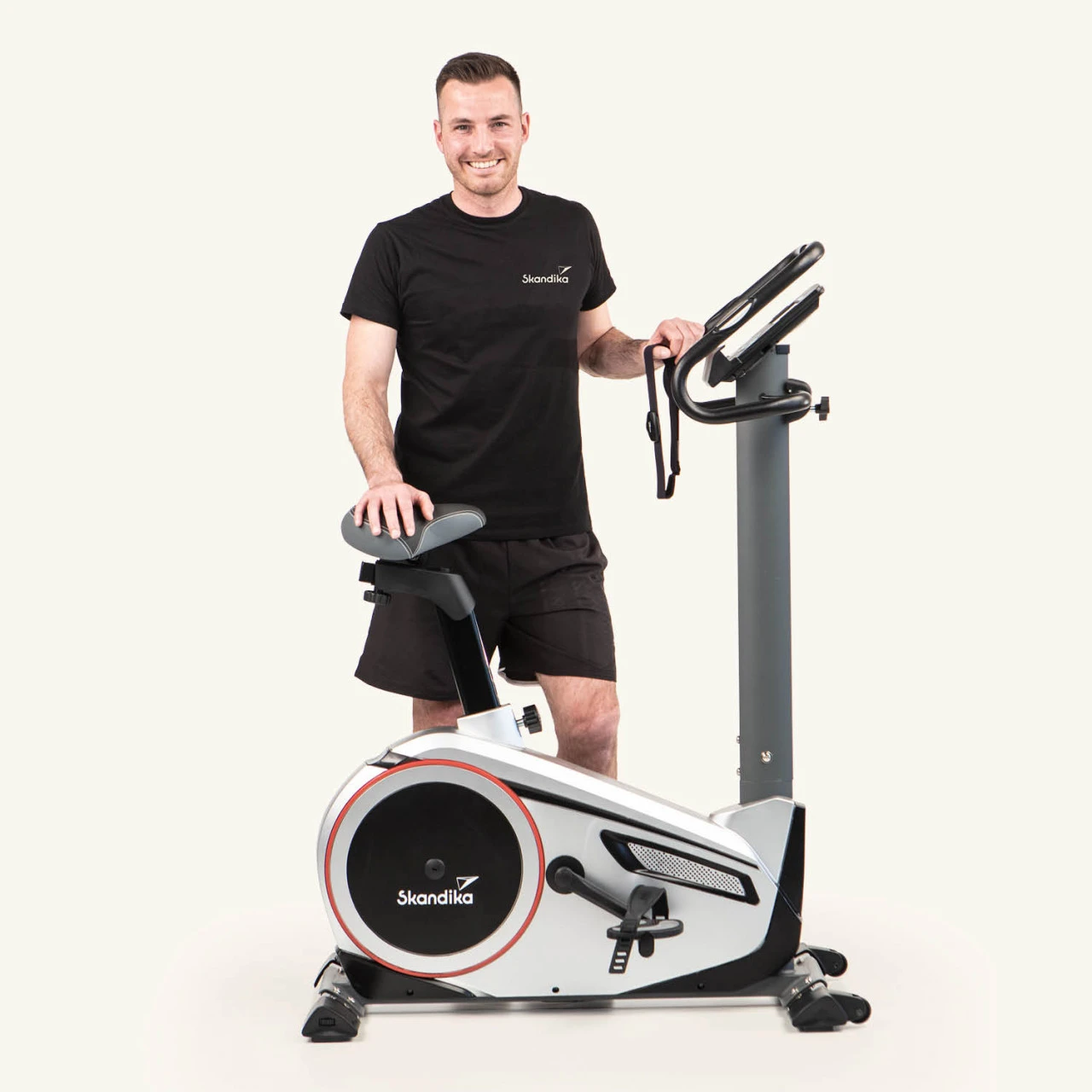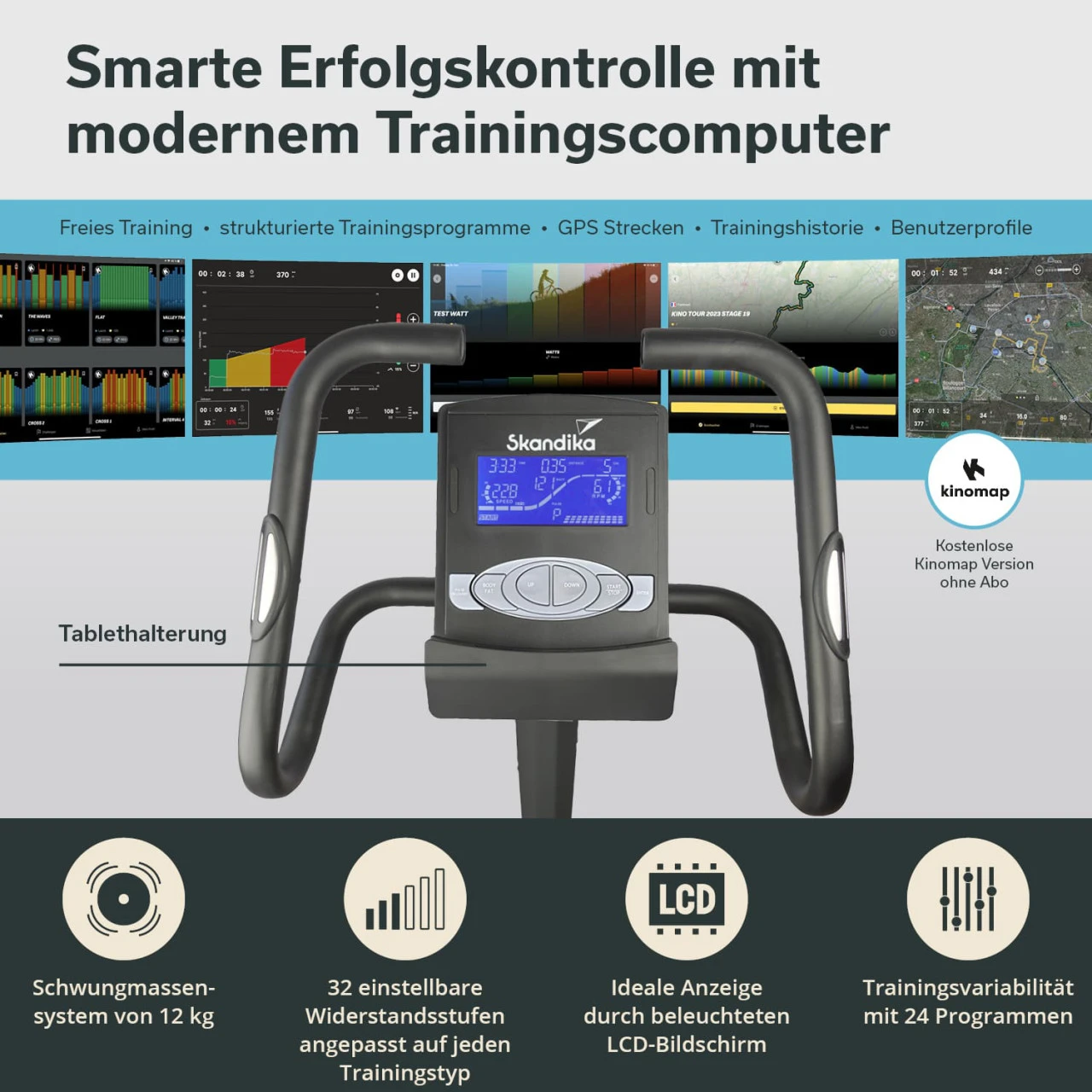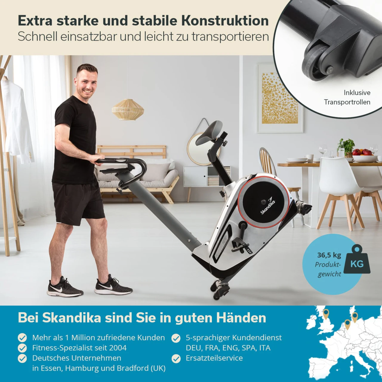 - Bequemer, gepolsterter Sattel, Pulssensoren im Lenker, Transportrollen, Skandika Brustgurt