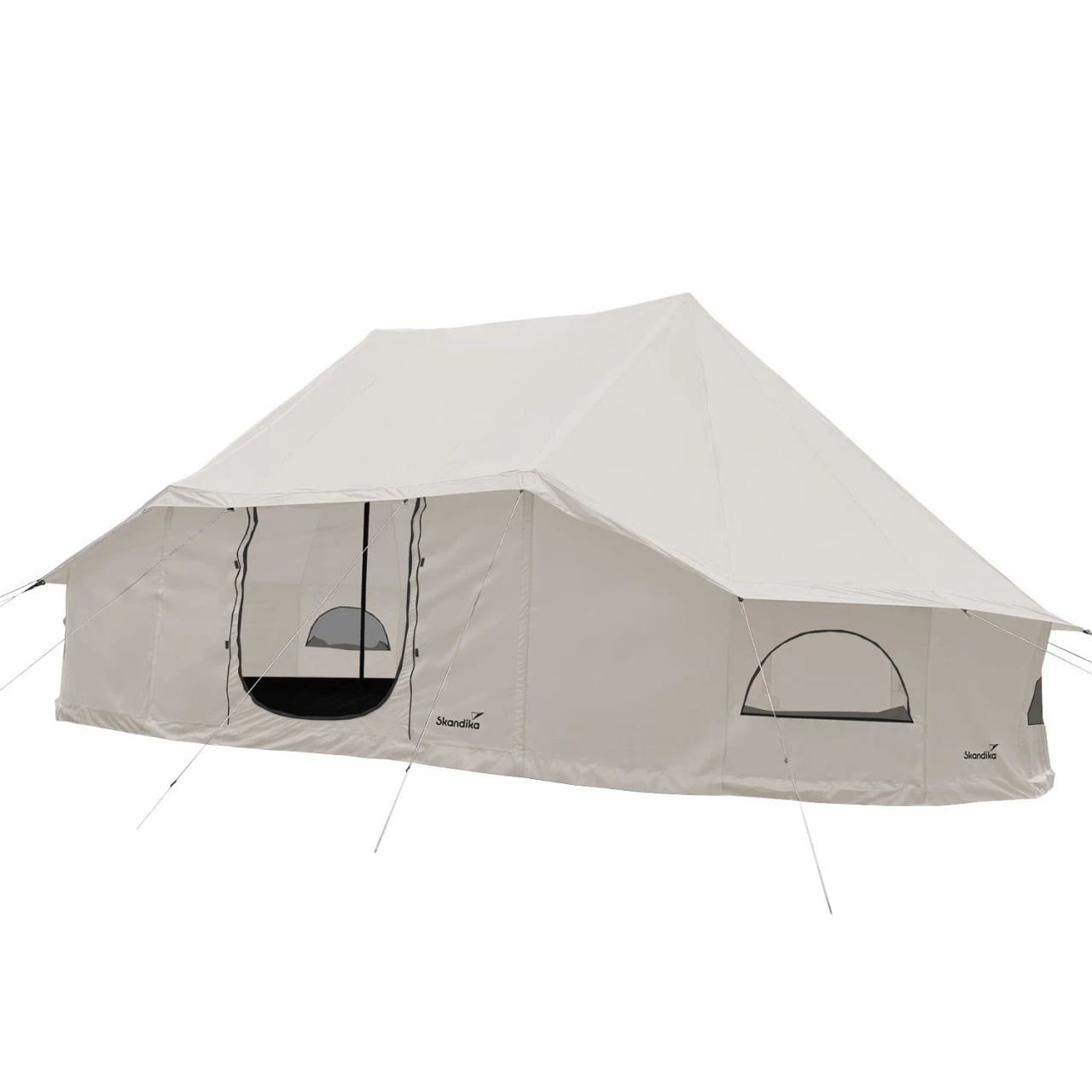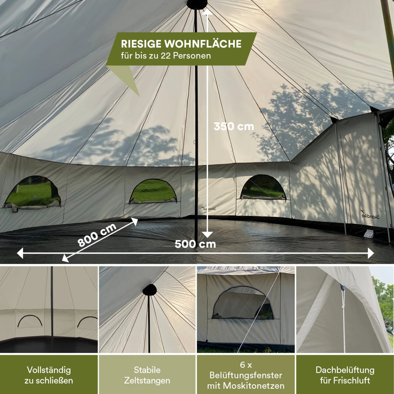 Das Zelt ist mit einer Wassersäule von 3000 mm wasserdicht. Der fest eingenähte Zeltboden sorgt dafür, dass das Zeltinnere schön trocken bleibt. Die große Eingangstür und die 6 Halbmondfenster sind mit Moskitonetz versehen damit lästige Insekten draußen bleiben und gleichzeitig eine gute Luftzirkulation herrscht. Alle Fenster können bei Bedarf abgedunkelt werden. Die Tür kann aufgerollt oder mit den zwei mitgelieferten Stangen zu einem schattenspendenden Vordach aufgestellt werden.