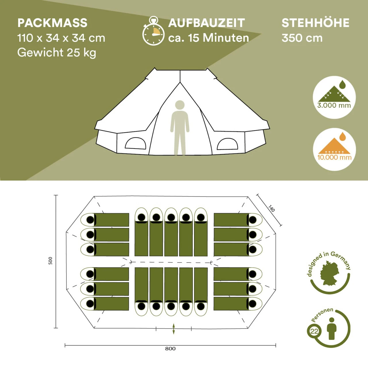 - Material Außenzelt: 210D Polyester, PU beschichtet