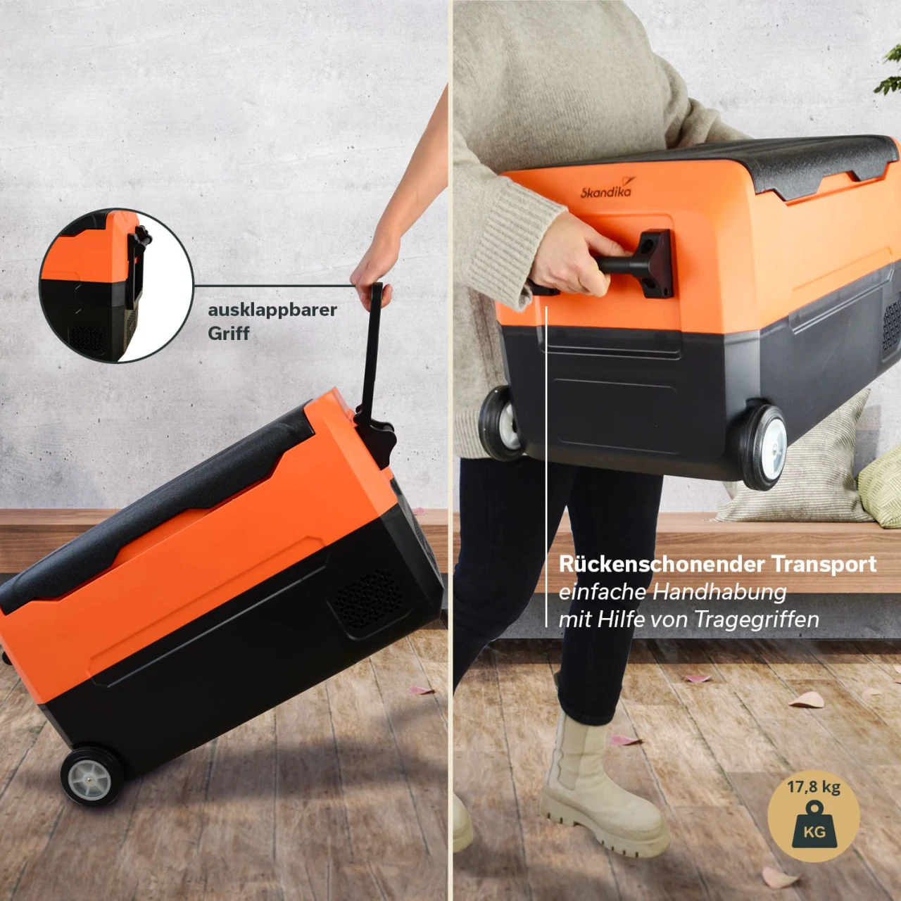 Mit ihren gerundeten Ecken und stoßsicherem ABS-Gehäuse ist die Gefrierbox äußerst robust. Feste Griffe an den beiden Kurzseiten erlauben ein rückenfreundliches Tragen und die Kombination aus stabilen Transportrollen und einem ausklappbaren Griff bietet selbst für eine vollbeladene Box eine sichere Transportmöglichkeit.