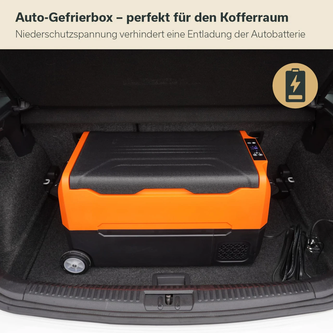 - Geräumige Box mit 35 bis 55 L Volumen – beide Kabel und Adapter sowie die Trennwand im Lieferumfang enthalten.