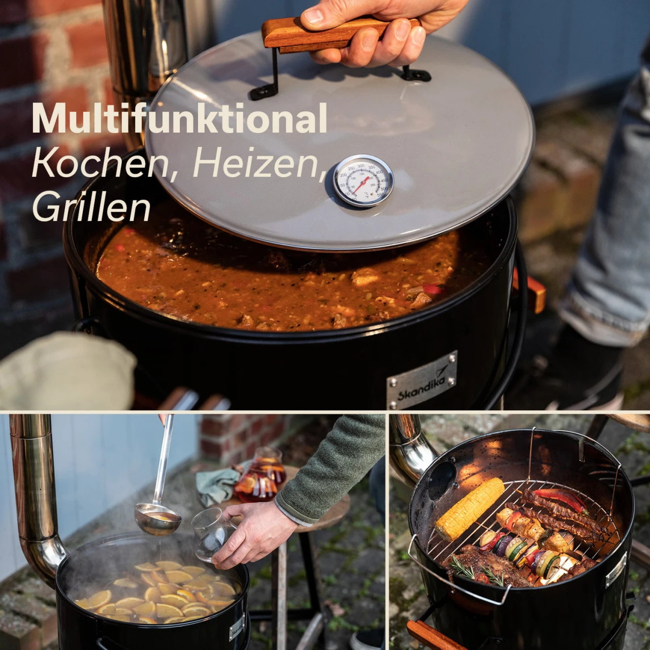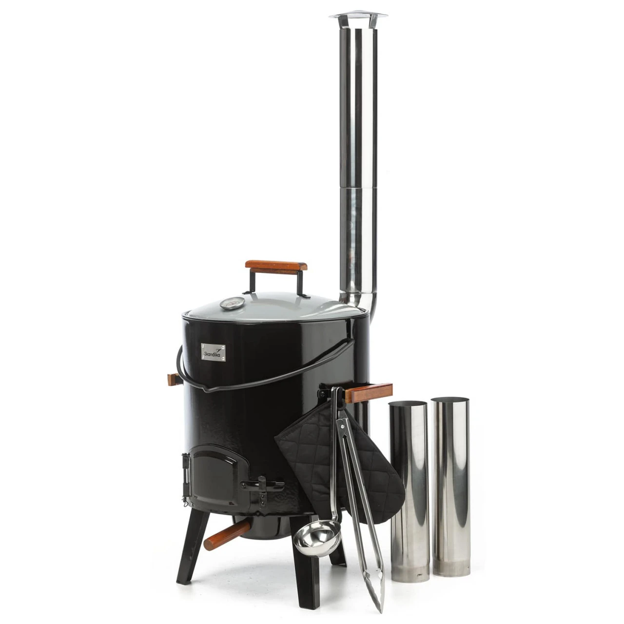 Aus schwarz emailliertem Stahl im Hochglanzlook mit schickem grauen Deckel, den hitzeunempfindlichen Holzgriffen, dem silberglänzenden Edelstahlschornstein und der hochwertigen Skandika-Plakette ist der Ofen nicht nur vielseitig und praktisch, sondern zudem auch ein echter Hingucker.