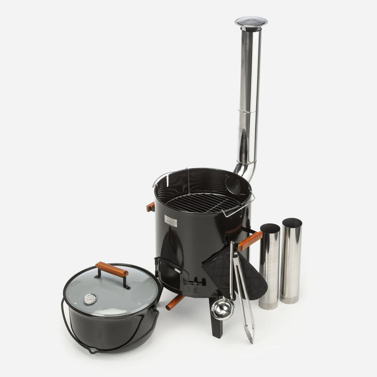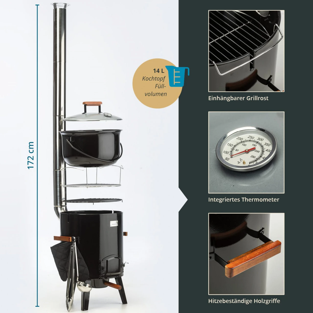 Eine praktische Grillzange und eine große Suppenkelle werden mitgeliefert und können griffbereit direkt an die seitlich angebrachten Kesselgriffe eingehängt werden. Ein Ofenhandschuh ist ebenfalls enthalten und das im Deckel integrierte Thermometer lässt die Temperatur im Kochtopf von außen gut kontrollieren.