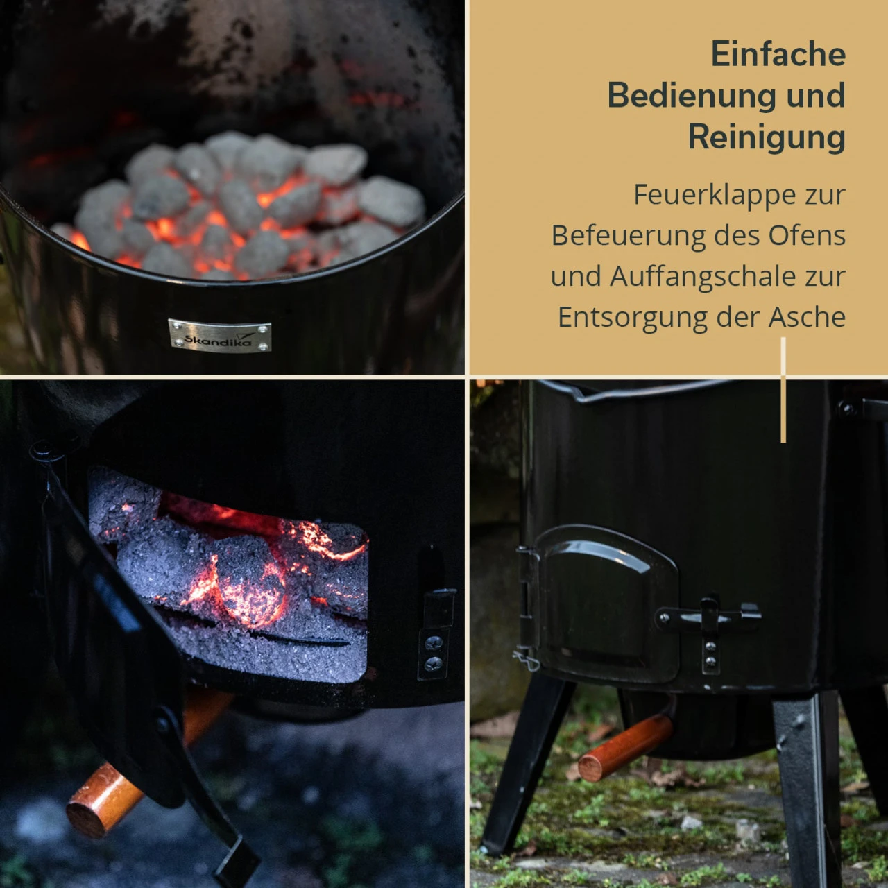 - Ascheauffangschale erleichtert das Reinigen des Kessels nach dem Gebrauch
