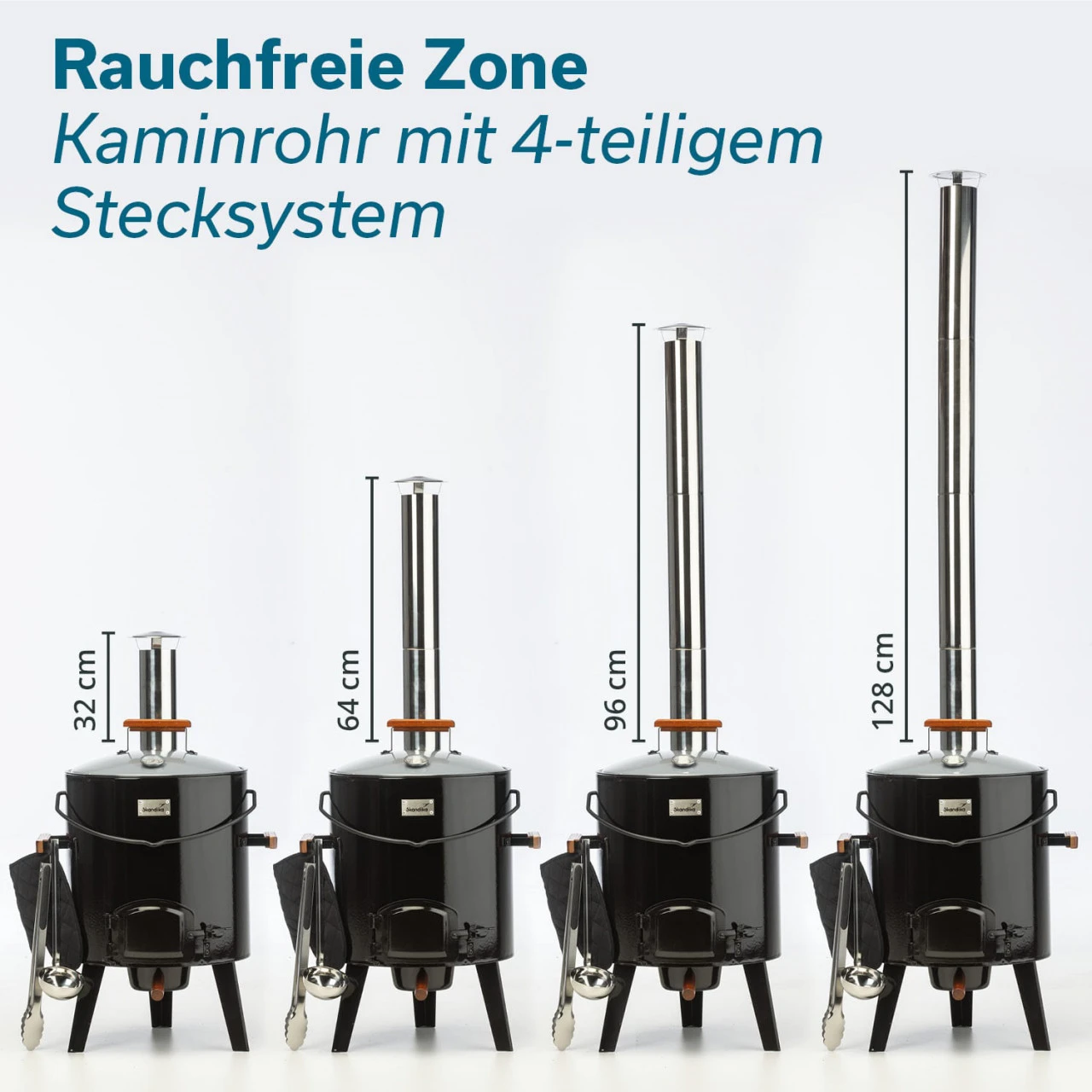 Das Kaminrohr mit cleverem Regenschutz sorgt für einen sauberen Rauchabzug. Es ist in der Länge variierbar, indem entweder 3 oder 4 Segmente zusammengesteckt werden, damit eine Nutzung des Kessels sowohl im Sitzen als auch im Stehen bequem und möglichst rauchfrei möglich ist.