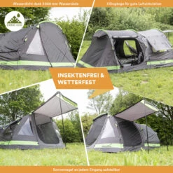 Die Kombination aus stabilen und doch flexiblen Fiberglas-Stangen, reißfestem, wasserdichtem Außenmaterial und dem kinderleichten Aufbau dieses praktischen Zeltes macht das Kambo 4 Protect vielseitig einsetzbar, ob als beliebter Begleiter für Familien, die es gerne unkompliziert mögen oder für eine Gruppe von Freunden, die gemeinsam zum nächsten Musikfestival aufbrechen möchte. Die gemütliche, dunkle Schlafkabine mit einem zusätzlichen, direkten Zugang von außen bietet bis zu vier Personen genügend Platz für eine bequeme Nacht.