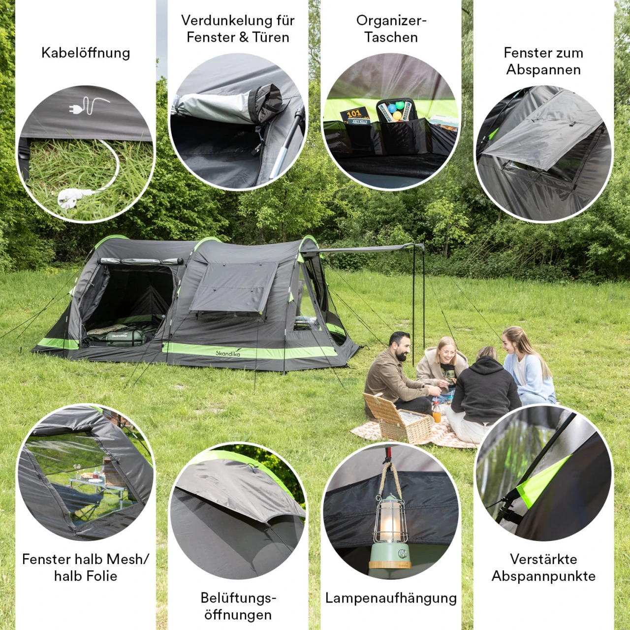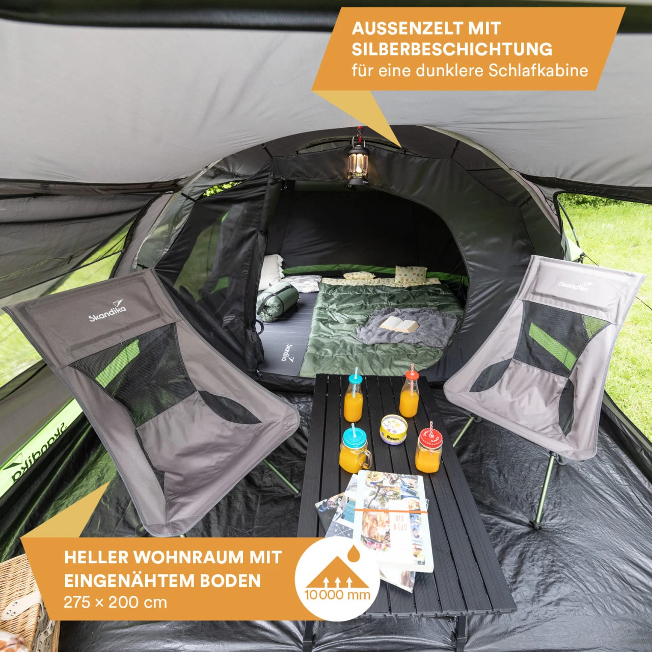 Das Zelt hat eine Silberbeschichtung des Außenzeltes im Bereich der Schlafkabinen. Diese Beschichtung kommt zwar nicht an den Verdunkelungsgrad der Skandika Sleeper Technologie heran, trägt aber dennoch zu einer spürbaren Verdunkelung bei und sorgt somit für einen erholsameren Schlaf. Der Vorraum eignet sich optimal zum Einrichten eines Wohnraums, indem Gepäck und Campingmöbel wie Tisch und Stühle Platz finden. Hier kann sich harmonisch zum Essen zusammengefunden oder Pläne für den nächsten Tag geschmiedet werden – es gibt viel Spielraum für die individuelle Gestaltung.