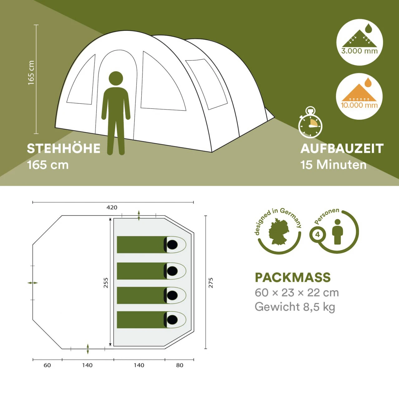 - Material (Außenzelt): 100% Polyester 190T, PU beschichtet