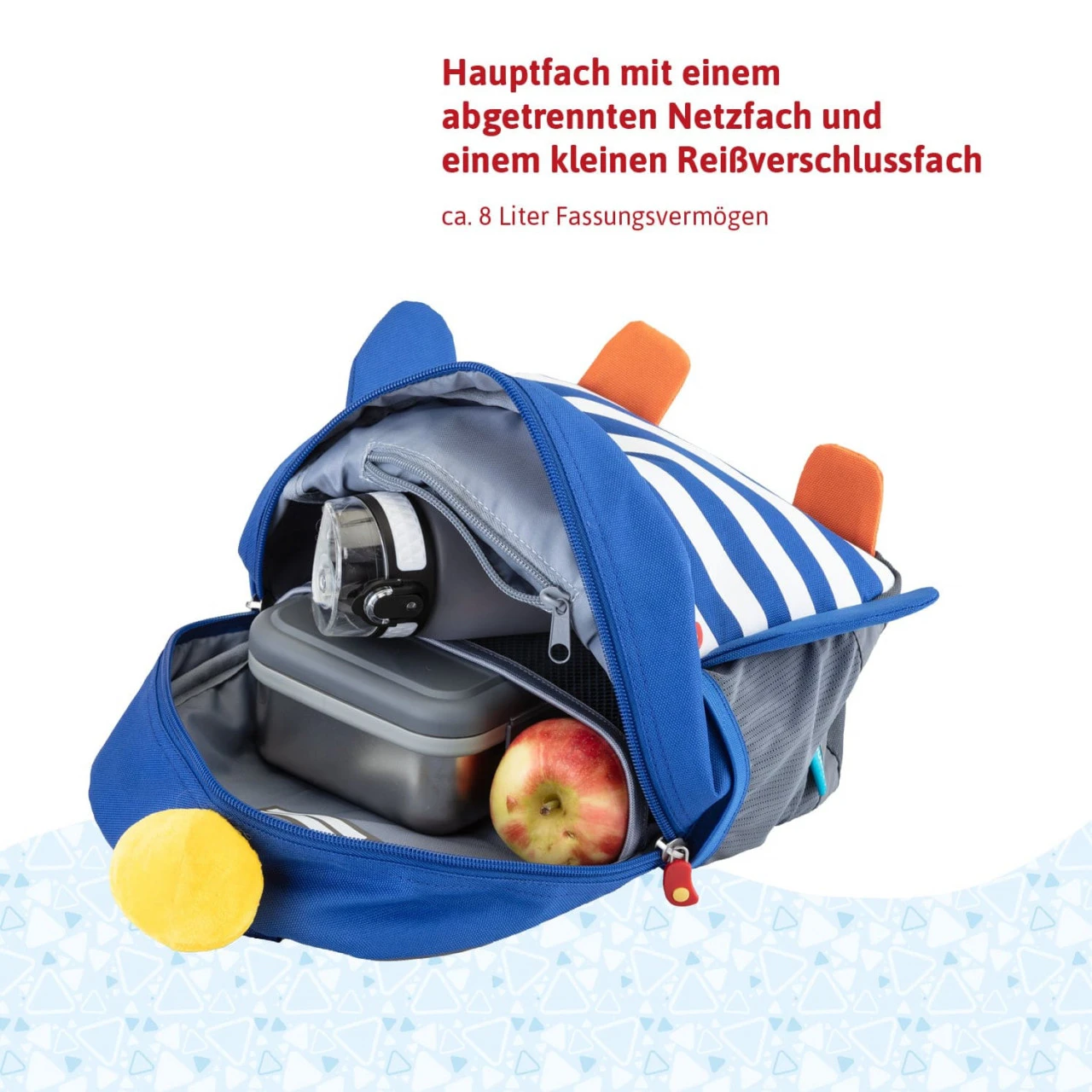 Außen hat der Rucksack zwei Netztaschen: perfekt für eine Trinkflasche oder einen Regenschirm. Die Seitentaschen und auch die Träger sind mit kleinen reflektierenden Elementen versehen, damit selbst im Dunkeln die Sorgenfresser keine Angst haben müssen.