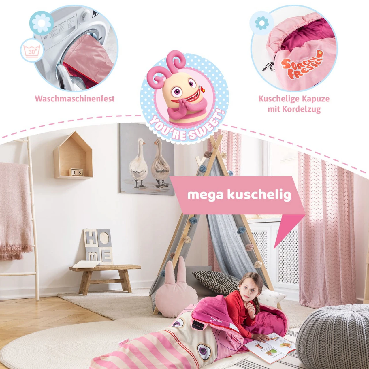 Sorgenfresser. Das sind die knuffigen kleinen Monster, die Kindern ihre Sorgen und Ängste abnehmen. Das pfiffige Design ist jedoch lange nicht alles, was die süßen Monster zu bieten haben – sie werden ebenfalls allen Ansprüchen eines qualitativ hochwertigen Kinderschlafsacks gerecht.